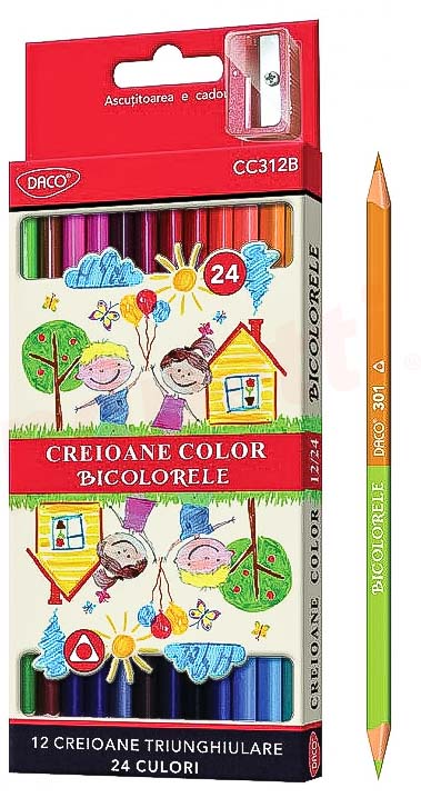 Creioane bicolor 24culori, 12bucati/set si o ascutitoare, Bicolorele Daco, CC312B