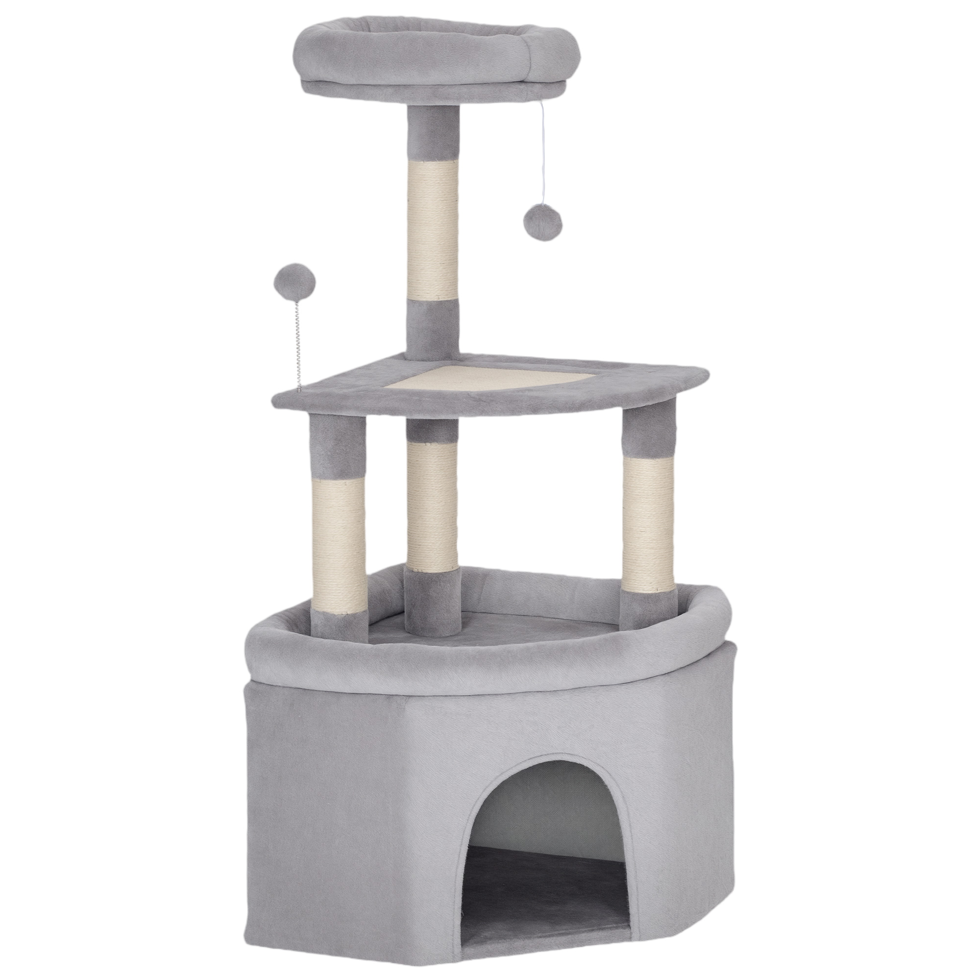 PawHut Copac pentru pisici turn de joacă cu stâlpi pentru zgâriat, platformă, căsuță, bilă, pluș, 60 x 45 x 90 cm, gri deschis | Aosom Romania