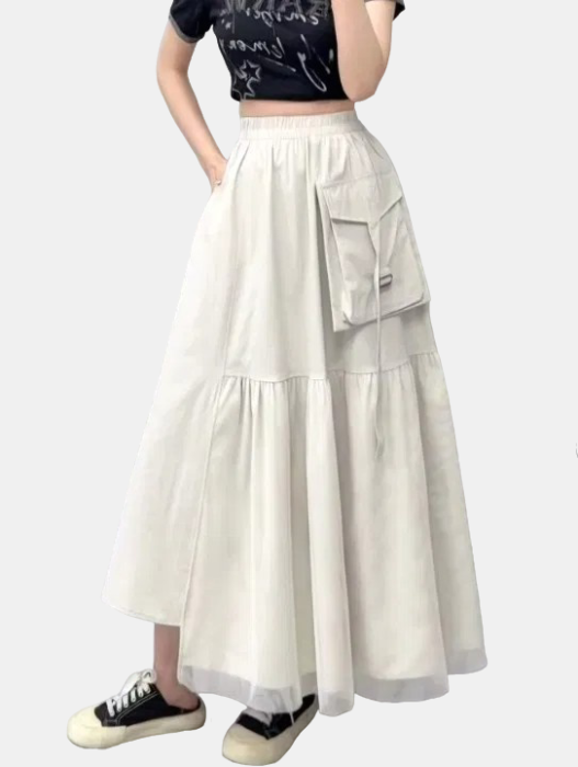 Fusta lunga cu insertie de tulle si buzunar aplicat, bej