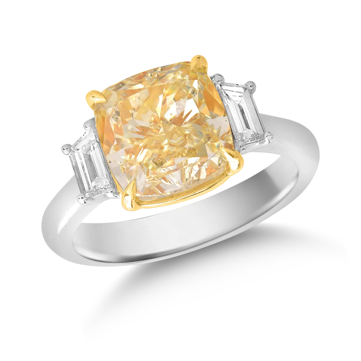 Inel de logodna din aur alb-galben cu diamant fancy galben cushion de 5.03ct si diamante de 0.43ct