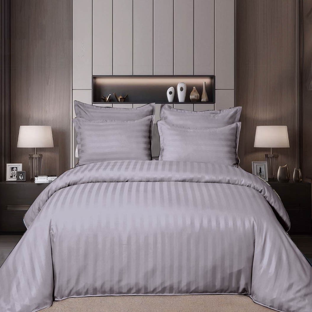 Lenjerie HoReCa, pat dublu, Damasc Finetat Deluxe cu Elastic, 6 piese, Pucioasa, Gri deschis