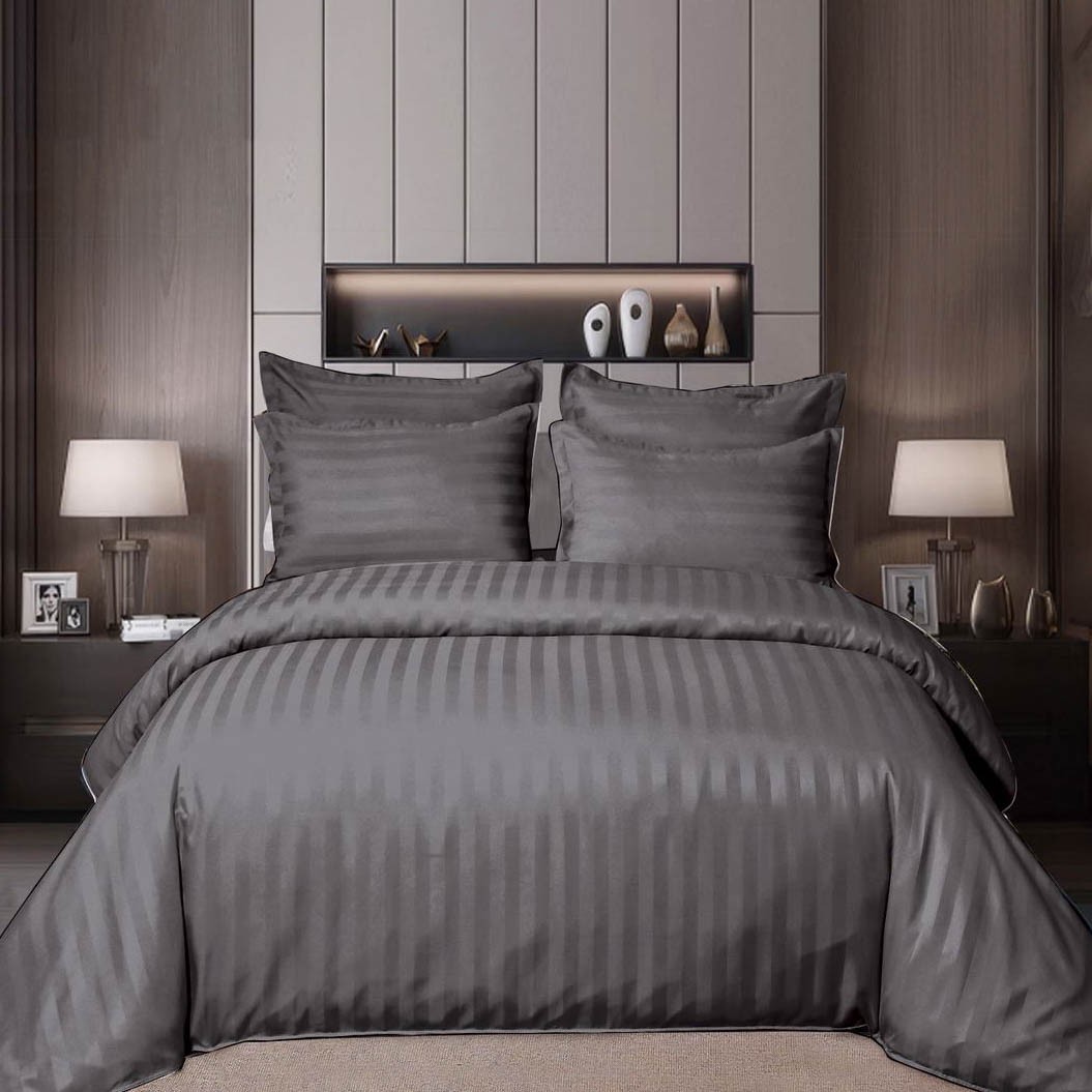 Lenjerie HoReCa, pat dublu, Damasc Finetat Deluxe cu Elastic, 6 piese, Pucioasa, Gri inchis