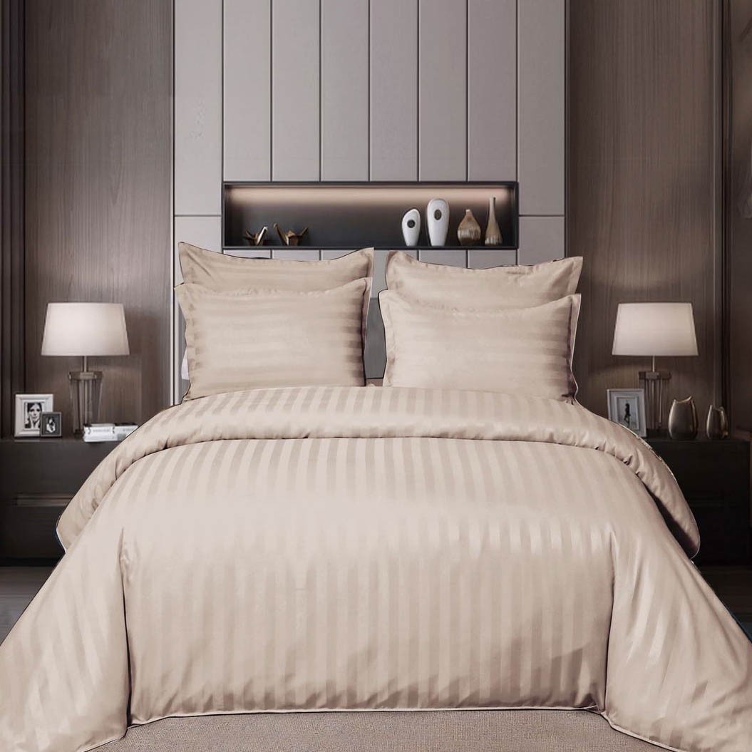 Lenjerie HoReCa, pat dublu, Damasc Finetat Deluxe cu Elastic, 6 piese, Pucioasa, Crem