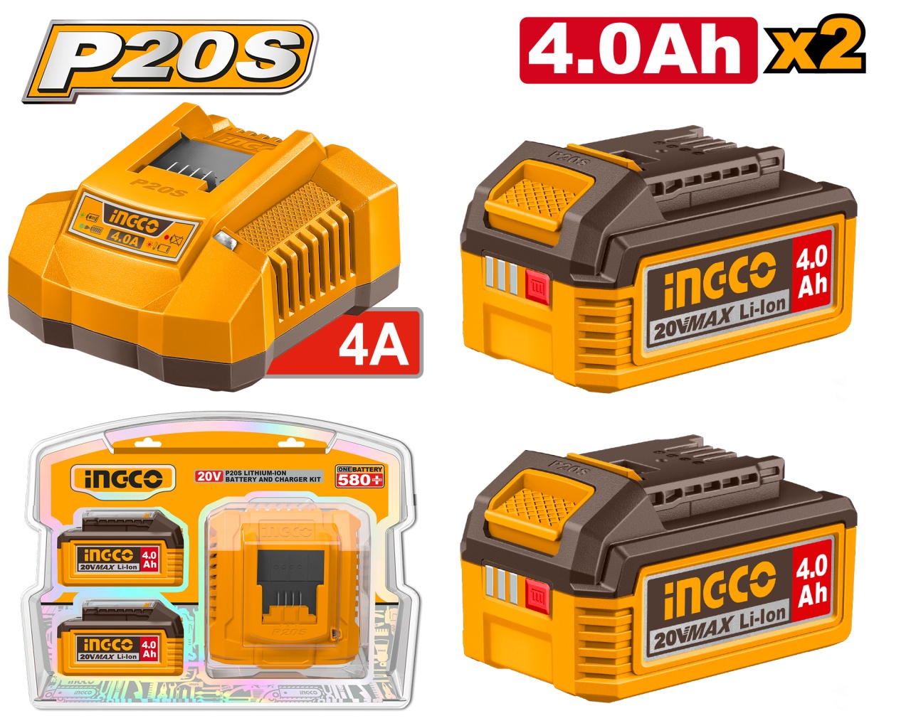 Set 2 Baterii 20V 4Ah + Incarcator Rapid INGCO – FBCPK2013E, Li-Ion, 4A, compatibil platforma P20S, cu LED indicator, autonomie extinsa Acumulator
