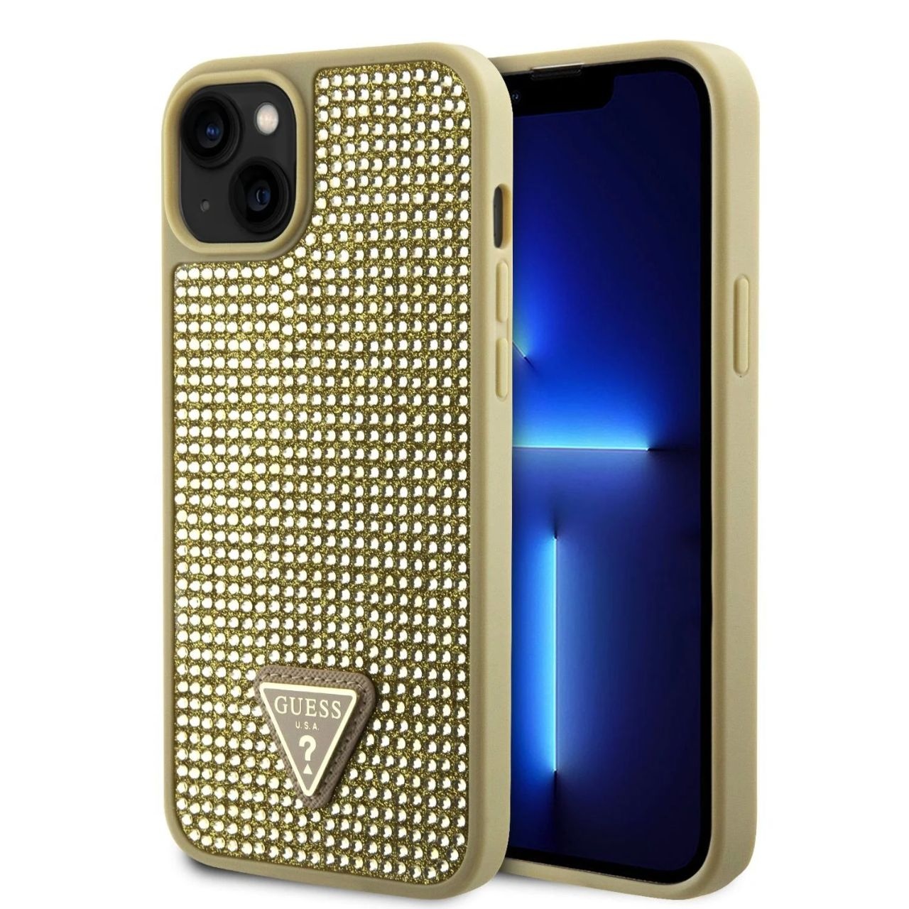 Husa de protectie pentru iPhone 15, auriu, Rhinestones Triangle Metal Logo, Guess