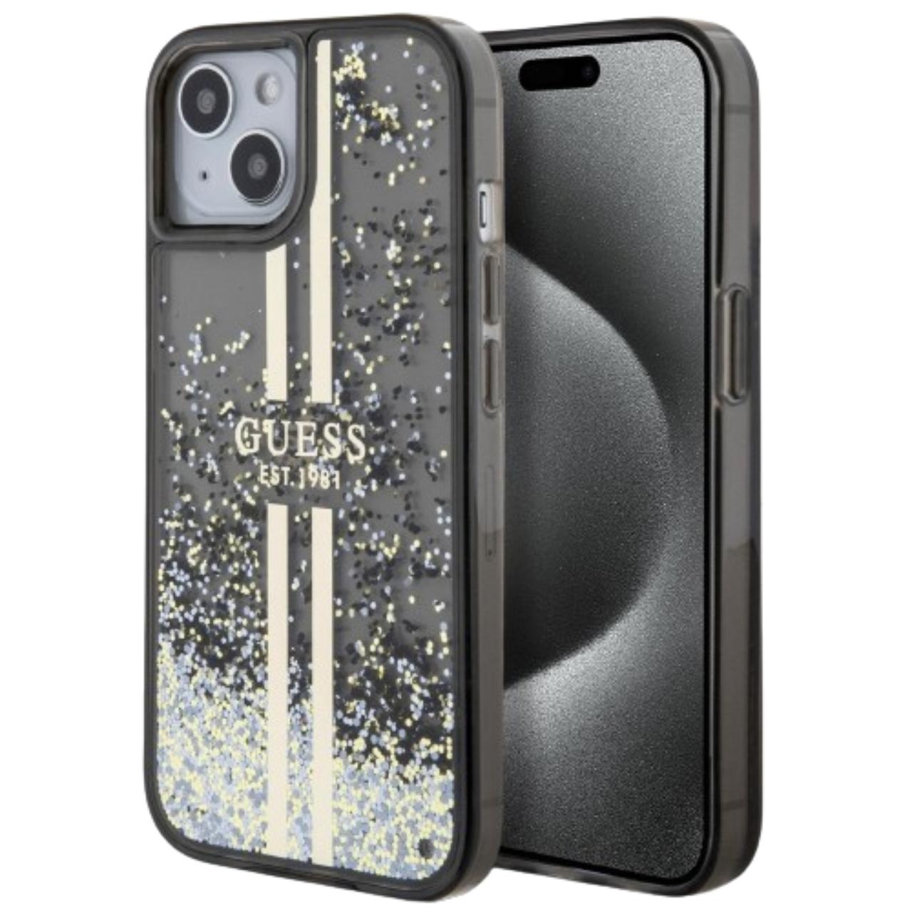 Husa de protectie pentru iPhone 15, negru, Liquid Glitter Gold Stripe, Guess