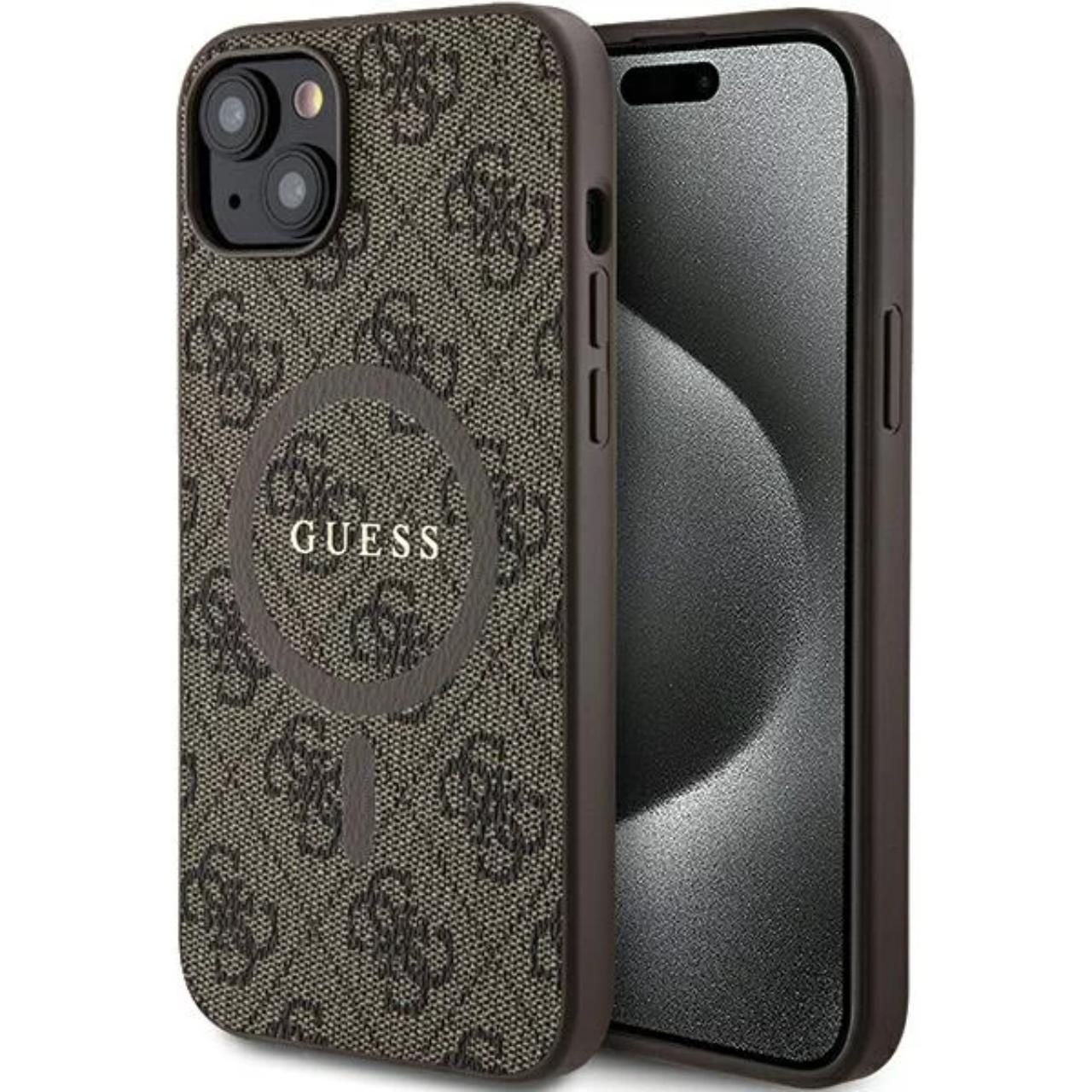 Husa de protectie pentru iPhone 15, maro, PU Leather 4G Colored Ring MagSafe, Guess
