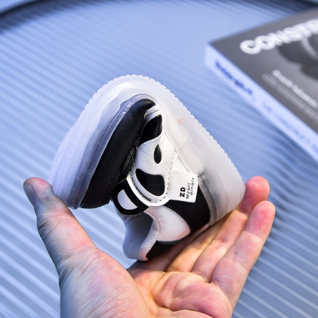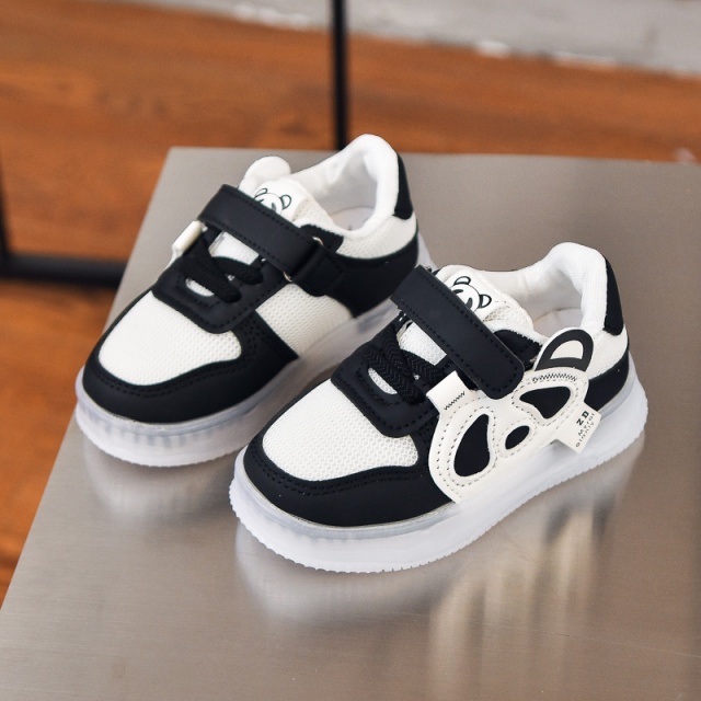 Marimi: 21 (lungime talpita in interior 12,5 cm) 22 (lungime talpita in interior 13 cm) 23 (lungime talpita in interior 13,5 cm) 24 (lungime talpita in interior 14 cm) 25 (lungime talpita in interior 14,5 cm) Adidasi pentru fetite, din material tip piele ecologica, prevazuti intr-o parte cu un ursulet panda. Se inchid cu sireturi din elastic si bareta cu arici intr-o parte. Culoare: alb cu negru Talpa: flexibila, din cauciuc cu beculete colorate ce se activeaza in timpul mersului. Bateriile sunt sub talpica si pot fi schimbate.