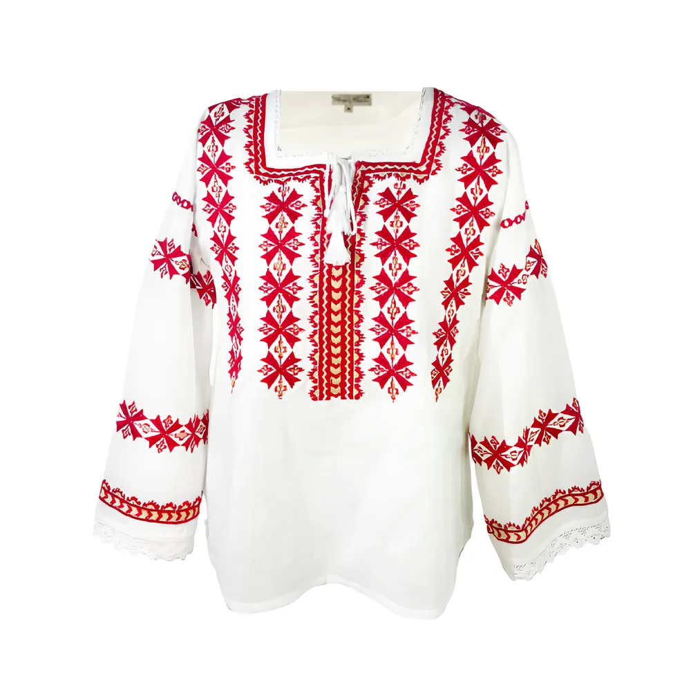 Bluza tip ie alba din bumbac cu maneca lunga si motiv geometric rosu. Modelul are 160 cm inaltime si poarta marimea S. • Material: bumbac• Culoare principala: alb• Culori secundare: rosu, auriu• Motiv floral• Broderie computerizata• Maneca lunga• Recomandari ingrijire: spalare automata la 30 grade sau spalare manuala Material: Bumbac Culoare principala: Alb Culori secundare: rosu, auriu Motiv: geometric Tip: Maneca lunga Recomandari ingrijire: spalare automata la 30 grade sau spalare manuala Dimensiune Inovius Masura EU Circumferinta bust Lungime S 40 105-110cm68cm M 42 110-115cm68cm L 44 115-120cm70cm XL 46 120-125cm72cm XXL 48 1225-130cm74cm 3XL 50130-135cm 75cm