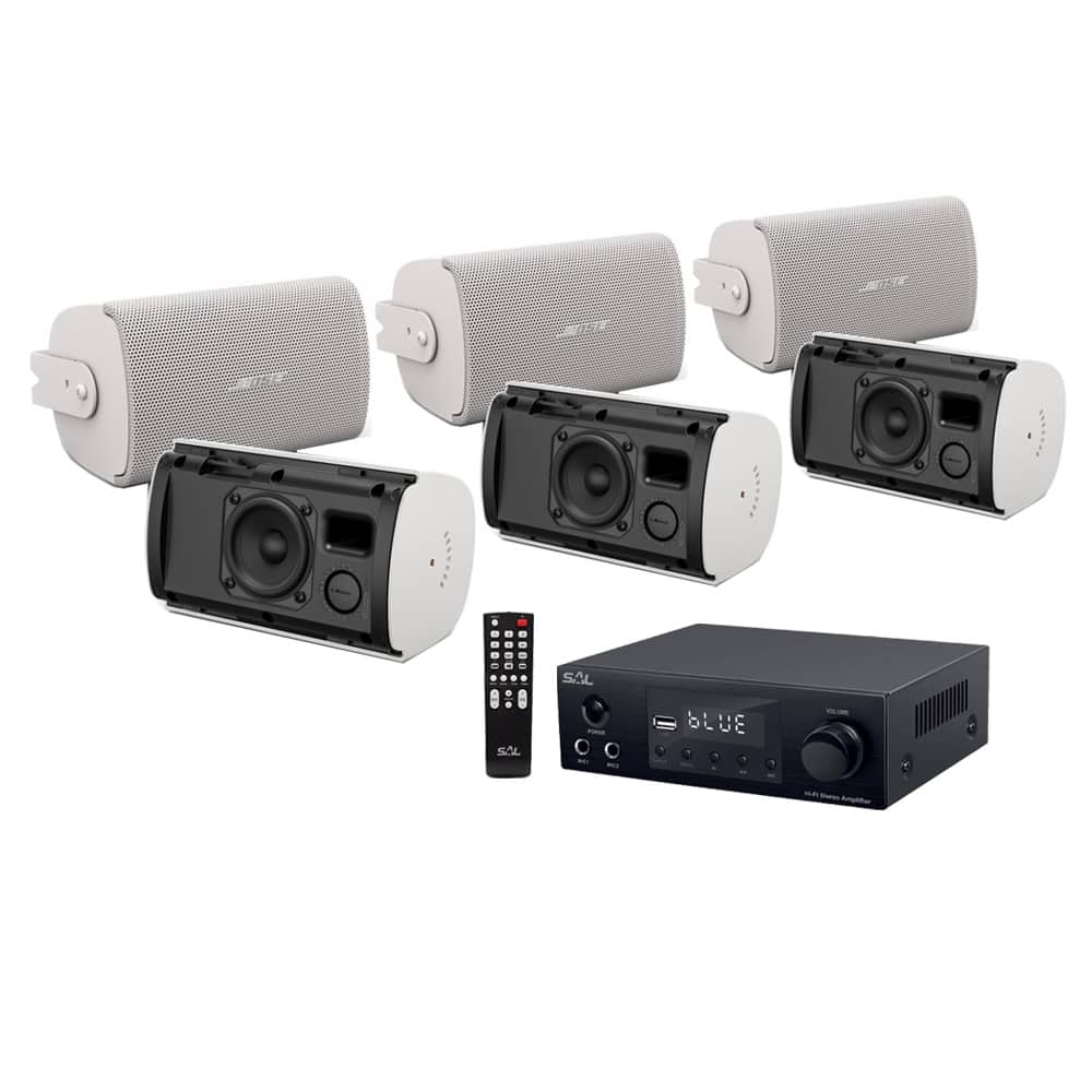Sistem boxe Bose Professional Freespace FS2-SE, cu 6 incinte de culoare alba si amplificator cu bluetooth/nIdeal pentru sonorizare terasa, gradina, piscina sau pentru restaurant, cefenea, etc.. De asemenea este foarte usor de conectat la TV prin intrarile Toslink sau Coax./n/nPutere 6x16W (RMS)/nStreaming bluetooth/nIzolat impotriva umiditatii IP55/nTuner FM/nIntrare Coax si Toslink/nBoxe albe/nControl bass si inalte/nSistem de aplicare perete inclus/n/nComutatorul din spatele grilajului va fi pozitionat pe 16 ohm, iar conectarea se va face stereo, cate 3 boxe pe fiecare canal./nCablurile de boxe nu sunt incluse, multe locatii fiind deja cablate/n/nSistem boxe Bose Professional compus din:/n/n6 boxe exterior Bose FreeSpace FS2SE/nAmplificator SAL BTA250/n/n/n*ATENTIE/n/n Acest tip de echipament necesita personal calificat pentru montaj/n Conectarea sau folosirea gresita a echipamentelor atrage PIERDEREA GARANTIEI /n