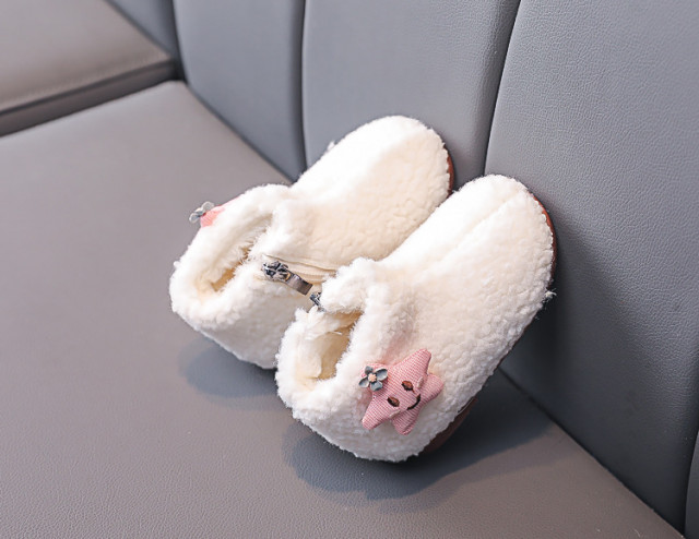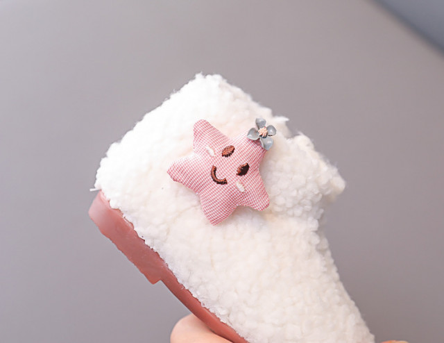 Marimi: 21 (13 cm lungime talpa interior) 22 (13,5 cm lungime talpa interior) 23 (14 cm lungime talpa interior) 24 (14,5 cm lungime talpa interior) 25 (15 cm lungime talpa interior) Botosei din blanita pentru fetite, se inchid cu fermoar intr-o parte si au aplicata o steluta roz. Culoare: alb Talpa: cauciuc
