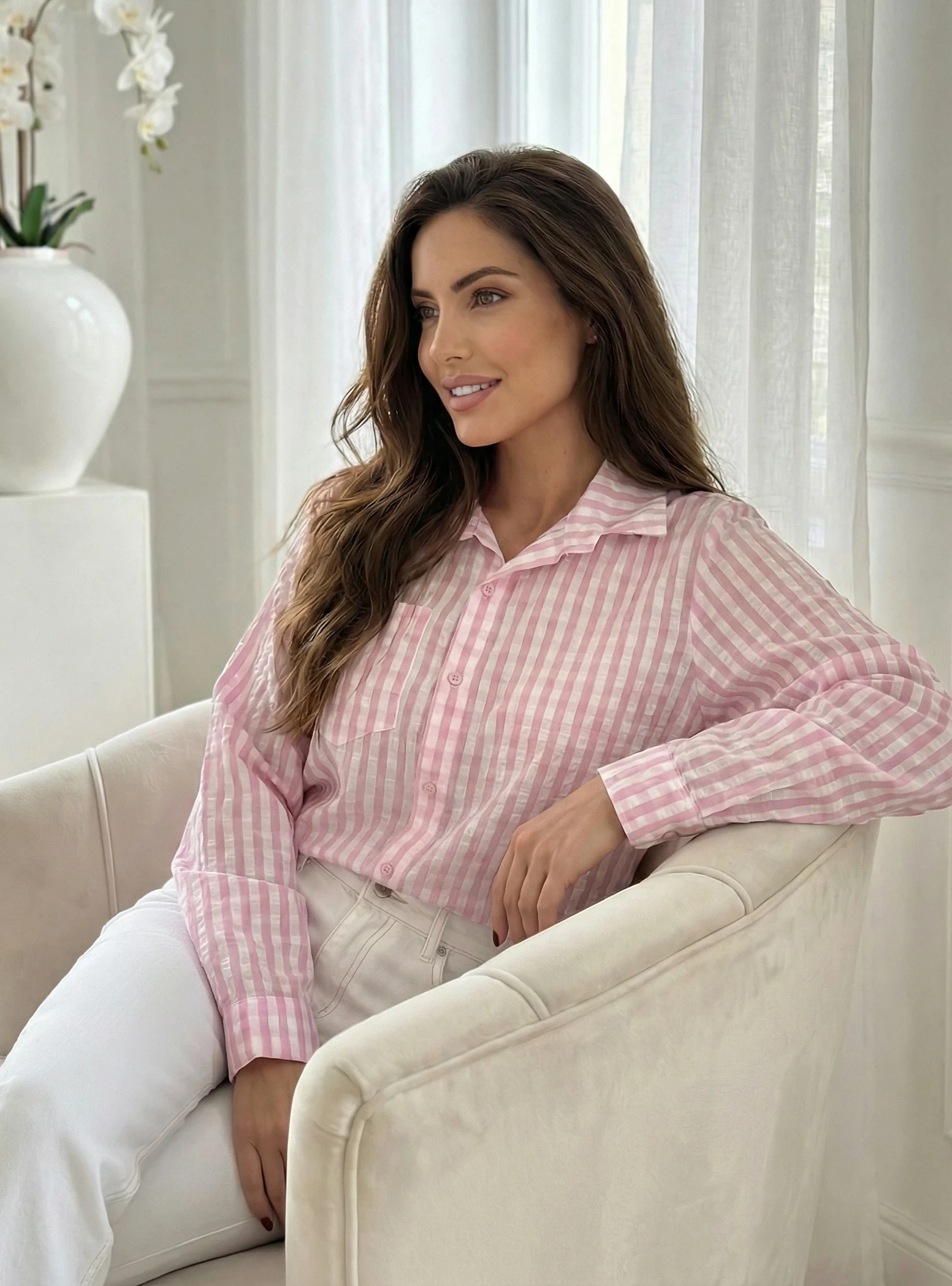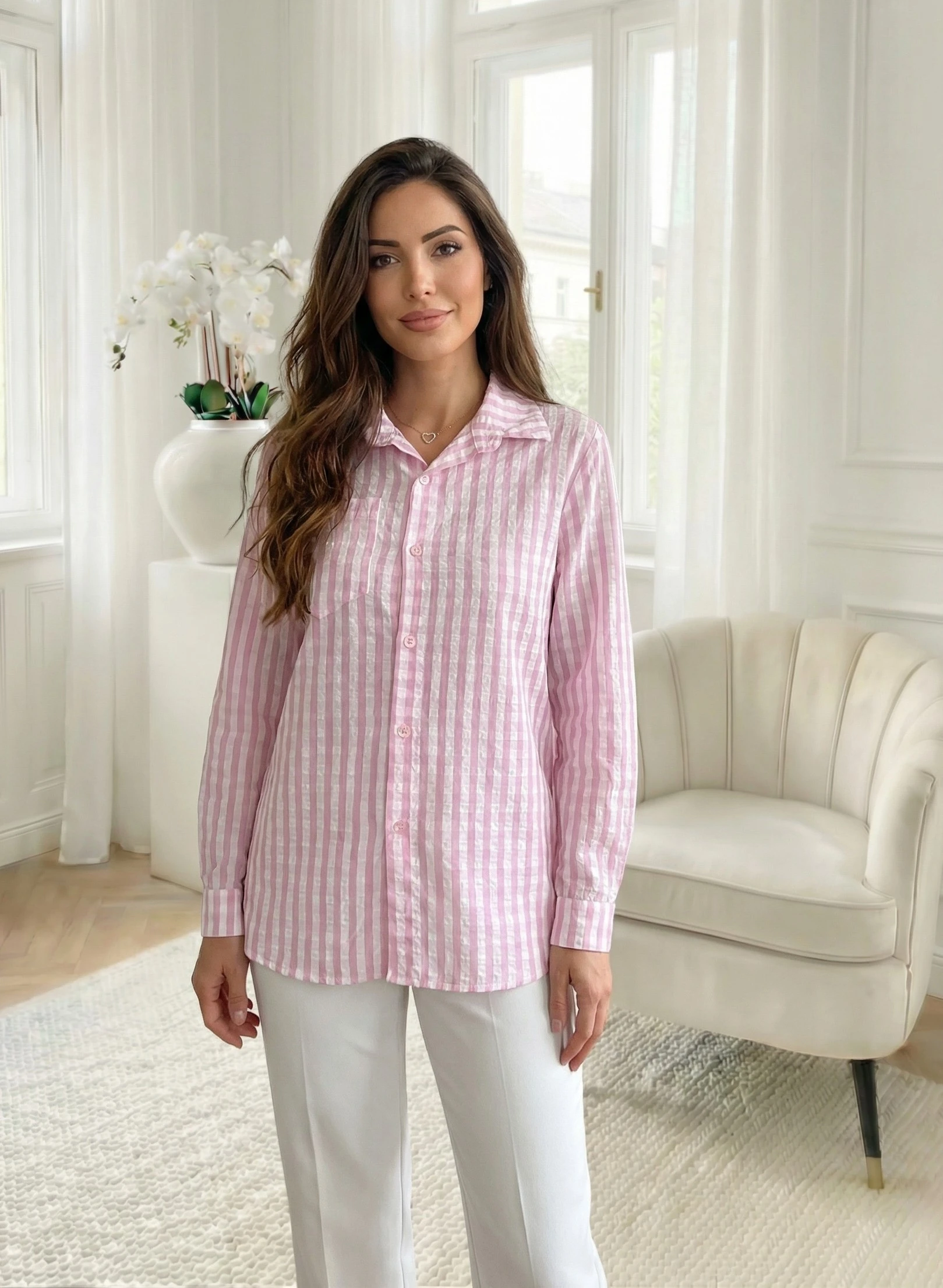 Camasa in carouri roz si alb, o piesa vestimentara esentiala pentru o garderoba moderna si relaxata, oferind un echilibru perfect intre stilul casual si cel office. Croiala lejera si materialul cu textura delicata asigura un confort sporit pe tot parcursu