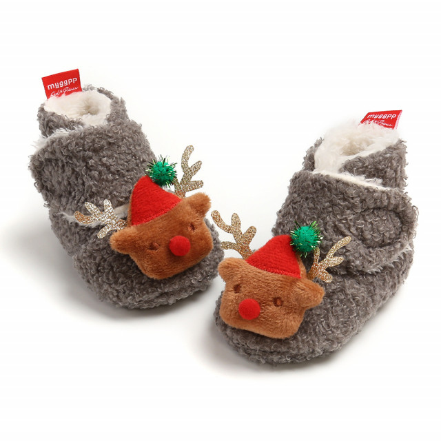 Marimi: 3-6 luni (lungime talpita la exterior 12 cm) 6-9 luni (lungime talpita la exterior 13 cm) 9-12 luni (lungime talpita la exterior 14 cm) Culoare: gri Model: cizmulite din blanita pentru bebelusi, cu un cap de ren aplicat in fata. Se inchid cu bareta lata cu arici. Talpa: din material textil.