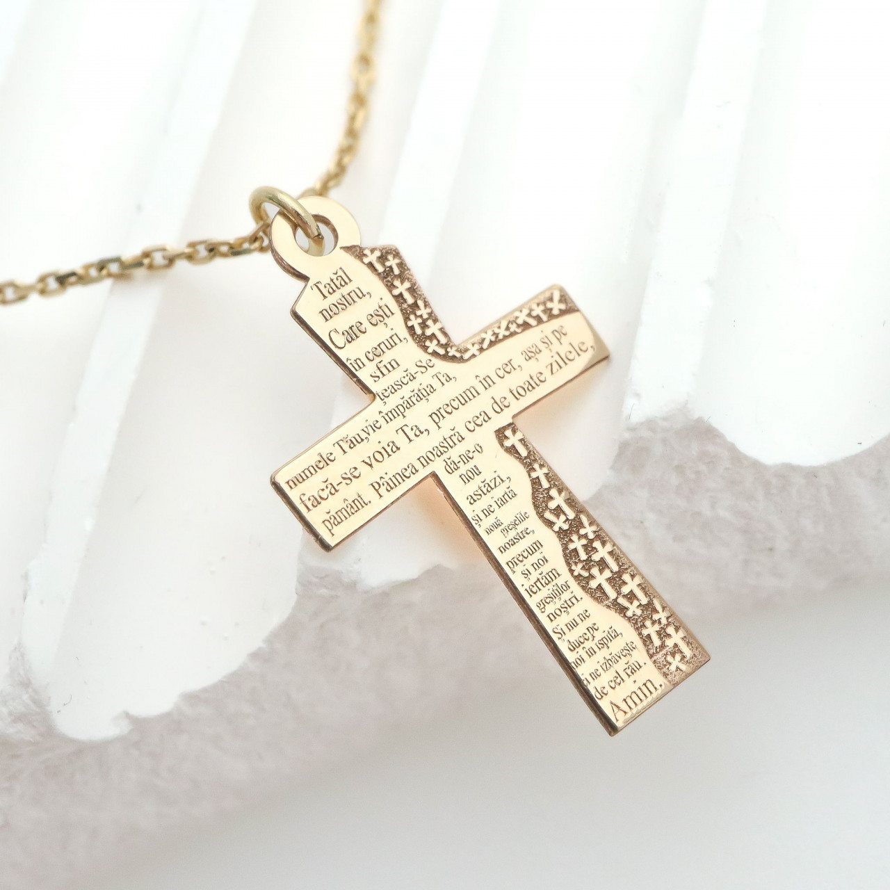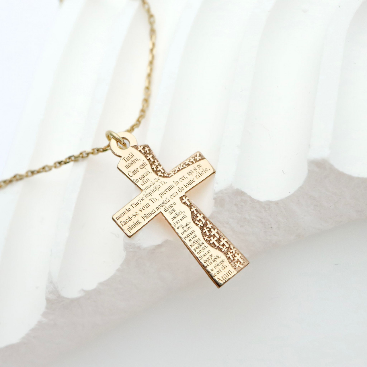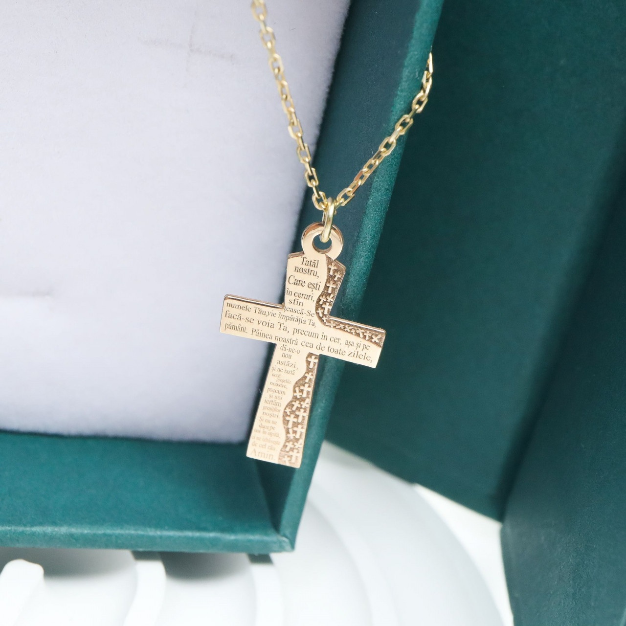 Descriere Acest colier rafinat, cu cruce Tatal Nostru, este o expresie sublimă a credinței și eleganței, realizat din aur de 14k. Cu un design delicat și semnificativ, această bijuterie nu doar că îmbogățește orice ținută, dar și poartă un mesaj spiritual profund. Ideal pentru a fi purtat zilnic sau la ocazii speciale, colierul este un simbol al devotamentului și al stilului personal. Fiecare detaliu este lucrat cu grijă, reflectând măiestria artizanilor noștri. Caracteristici principale Specificații: Colier cu pandantiv cruce Tatal Nostru Material: Aur 14k Design: Pandantiv cu cruce gravată cu rugăciunea Tatal Nostru Dimensiuni: Dimensiuni standard ale pandantivului Gramaj: ~ 2 grame Personalizare: Opțiuni de personalizare disponibile la cerere Meșteșug Fiecare colier este realizat cu o atenție deosebită la detalii, folosind tehnici tradiționale de prelucrare a aurului. Artizanii noștri se asigură că fiecare piesă este perfect finisată, oferind o strălucire care să dureze o viață întreagă. Purtare și stil Acest colier este versatil și poate fi purtat cu orice ținută, de la cele casual la cele elegante. Este perfect pentru a adăuga o notă de rafinament și spiritualitate stilului tău zilnic. Idee de cadou Colierul cu cruce Tatal Nostru din aur 14k este un cadou ideal pentru cei dragi, fie că este vorba de o aniversare, o zi de naștere sau o sărbătoare religioasă. Este un dar care va fi prețuit pentru semnificația sa profundă și frumusețea sa atemporală. Îngrijire și întreținere Pentru a păstra strălucirea colierului, se recomandă curățarea regulată cu o cârpă moale și evitarea contactului cu substanțe chimice dure. Depozitați colierul într-un loc uscat și ferit de lumina directă a soarelui. De ce să alegi această bijuterie Acest colier nu este doar o bijuterie, ci o declarație de credință și stil. Realizat din aur de 14k, este durabil și elegant, perfect pentru cei care apreciază frumusețea clasică și semnificația spirituală. Este o piesă de colecție care va aduce bucurie și inspirație purtătorului său. * Prețul standard afișat pe site este prețul de bază al bijuteriei, fără alte opțiuni extra, opțiuni ce se pot selecta din pagina de produs (doar unde este cazul) și generează cost suplimentar. * Personalizarea este posibilă doar la piesele ce permit acest lucru, iar prețul standard selectabil în pagina de produs face referire la personalizare simplă cu text sau simbol. Pentru alte opțiuni de personalizare mai complexă, prețul va fi comunicat telefonic. * Fotografiile, gramajele și dimensiunile sunt prezentate cu titlu orientativ, iar în realitate culorile pot fi ușor diferite, iar specificațiile privind mărimea și greutatea pot varia ușor în funcție de tipul de finisaj aplicat. * Din dorința de a surprinde cât mai bine detaliile bijuteriei, este posibil ca în fotografie unele piese să pară mai mari decât în realitate. Citește cu atenție specificațiile din descriere.