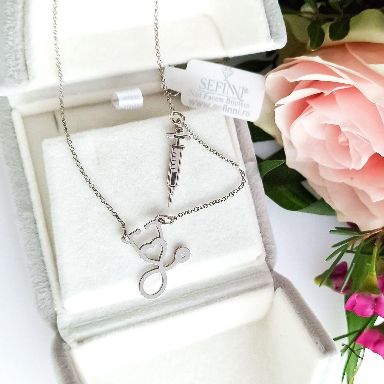 Descriere Acest colier din argint 925 este o adevărată declarație de stil și pasiune, perfect pentru cei care își dedică viața profesiilor medicale. Cu un design unic ce îmbină simbolurile unui stetoscop și al unei seringi, această bijuterie nu este doar un accesoriu, ci și o celebrare a vocației. Fiecare detaliu este meticulos lucrat, reflectând atât eleganța, cât și dedicarea. Ideal pentru a fi purtat zilnic sau la ocazii speciale, acest colier va atrage cu siguranță toate privirile. Caracteristici principale Specificații: Colier din argint 925, cu figurine reprezentând un stetoscop și o seringă. Material: Argint 925, cunoscut pentru durabilitatea și strălucirea sa. Design: Figurine detaliate de stetoscop și seringă, simbolizând profesia medicală. Dimensiuni: Dimensiuni variabile, adaptabile pentru confortul purtătorului. Gramaj: variabil. Personalizare: Posibilitatea de a adăuga un mesaj personalizat sau simboluri suplimentare. Meșteșug Fiecare piesă este realizată cu atenție la detalii, folosind tehnici tradiționale de prelucrare a argintului. Meșteșugarii noștri se asigură că fiecare colier este finisat la cele mai înalte standarde, oferindu-vă o bijuterie de calitate superioară. Purtare și stil Acest colier este perfect pentru a fi purtat zilnic, adăugând o notă de eleganță și profesionalism ținutelor dumneavoastră. Se potrivește de minune cu o cămașă albă sau o rochie simplă, punând în valoare dedicarea dumneavoastră față de profesia medicală. Idee de cadou Un cadou minunat pentru medicii, asistentele sau studenții la medicină din viața dumneavoastră. Oferiți-l cu ocazia unei promovări, a unei aniversări sau pur și simplu pentru a arăta aprecierea față de eforturile lor neobosite. Îngrijire și întreținere Pentru a păstra strălucirea argintului, curățați colierul cu o cârpă moale și evitați contactul cu substanțe chimice dure. Depozitați-l într-un loc uscat și răcoros atunci când nu este purtat. De ce să alegi această bijuterie Alegeți acest colier pentru a vă exprima dragostea față de profesia medicală și pentru a adăuga o notă personală stilului dumneavoastră. Designul său unic și materialele de calitate fac din această bijuterie o alegere excelentă pentru oricine dorește să îmbine eleganța cu semnificația personală. * Prețul standard afișat pe site este prețul de bază al bijuteriei, fără alte opțiuni extra, opțiuni ce se pot selecta din pagina de produs (doar unde este cazul) și generează cost suplimentar. * Personalizarea este posibilă doar la piesele ce permit acest lucru, iar prețul standard selectabil în pagina de produs face referire la personalizare simplă cu text sau simbol. Pentru alte opțiuni de personalizare mai complexă, prețul va fi comunicat telefonic. * Fotografiile, gramajele și dimensiunile sunt prezentate cu titlu orientativ, iar în realitate culorile pot fi ușor diferite, iar specificațiile privind mărimea și greutatea pot varia ușor în funcție de tipul de finisaj aplicat. * Din dorința de a surprinde cât mai bine detaliile bijuteriei, este posibil ca în fotografie unele piese să pară mai mari decât în realitate. Citește cu atenție specificațiile din descriere.