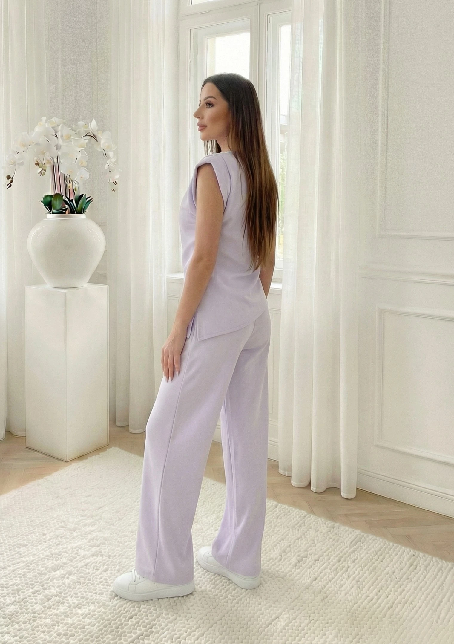 Compleu lila elegant cu pantaloni evazati si bluza drapata, alegerea perfecta pentru un look modern, oferind o silueta fluida si sofisticata. Bluza se remarca prin umerii accentuati si croiala asimetrica in partea de jos, cu un drapaj lateral ce cade natu