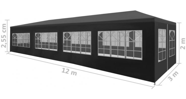 SpecificațiiCuloare: AntracitMaterial: Acoperis si panouri laterale din PE + cadru din oțelDimensiuni: 12 x 3 x 2,55 m (L x l x î)Înaltime de la sol la streasina: 2 mRezistent la raze UV si apaMateriale de montaj incluseMaterial: Poliester: 100% DescriereCortul de petrecere ofera un spațiu minunat în care sa va distrați alaturi de familie si prieteni la o varietate de petreceri si reuniuni în aer liber.Pavilionul de gradina este realizat din polietilena rezistenta la apa si raze UV, fiind foarte practic pentru utilizarea în exterior.Cadrul este fabricat din oțel rezistent la rugina, asigurand stabilitate si durabilitate copertinei de exterior.Cortul de petreceri este prevazut cu panouri laterale, fiecare cu ferestre decorative, si cu o usa cu fermoar, pentru acces usor.Pavilionul de gradina este usor de asamblat.Va rugam sa rețineți ca se recomanda tratarea copertinei cu un spray de impermeabilizare, daca marchiza este expusa la precipitații abundente.NOTa: Acest produs nu trebuie utilizat NICIODATA în conditii de vremea rea, precum vant puternic, ploaie abundenta, zapada, furtuna etc.