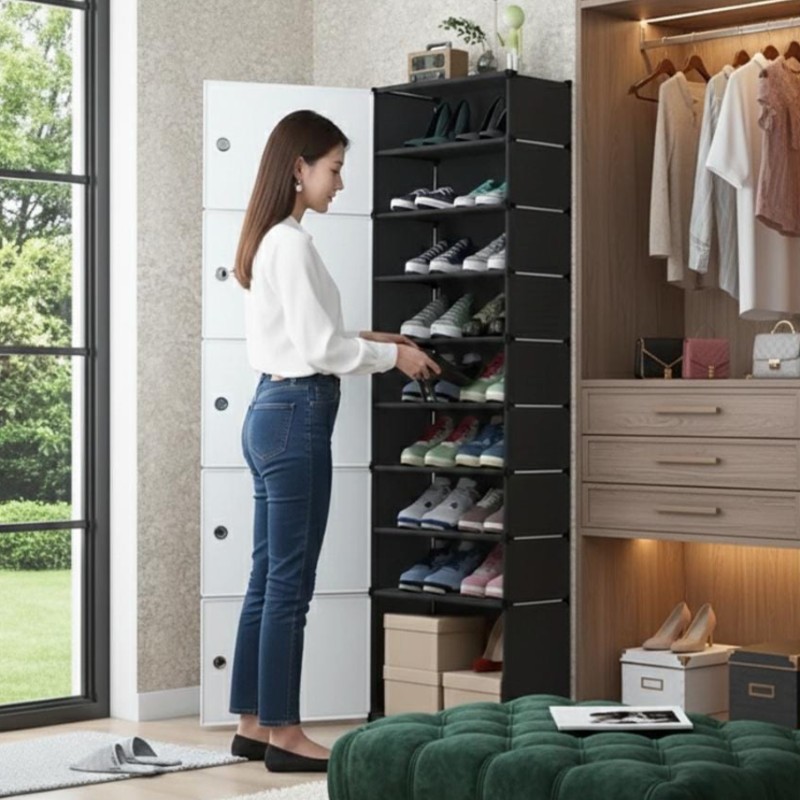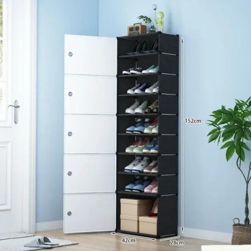 Dulap depozitare incaltaminte Etajera incaltaminte cu 9 compartimente Organizeaza rapid incaltamintea in hol, dormitor sau dressing cu un pantofar vertical, gandit pentru economisirea spatiului. Cele 9 compartimente permit depozitarea ordonata a mai multor perechi, cu acces usor, astfel incat podeaua ramane libera si zona de intrare arata mereu ingrijit. Format ingust, potrivit pentru spatii mici (holuri, garsoniere, colturi neutilizate) 9 compartimente pentru sortare pe tipuri: sport, casual, pantofi de ocazie Depozitare protejata: ajuta la mentinerea incaltamintei ferite de praf si la pastrarea aspectului ordonat Acces rapid la perechea dorita, fara sa rascolesti alte cutii Dimensiuni: Inaltime: 152 cm Latime: 42 cm Adancime: 28 cm