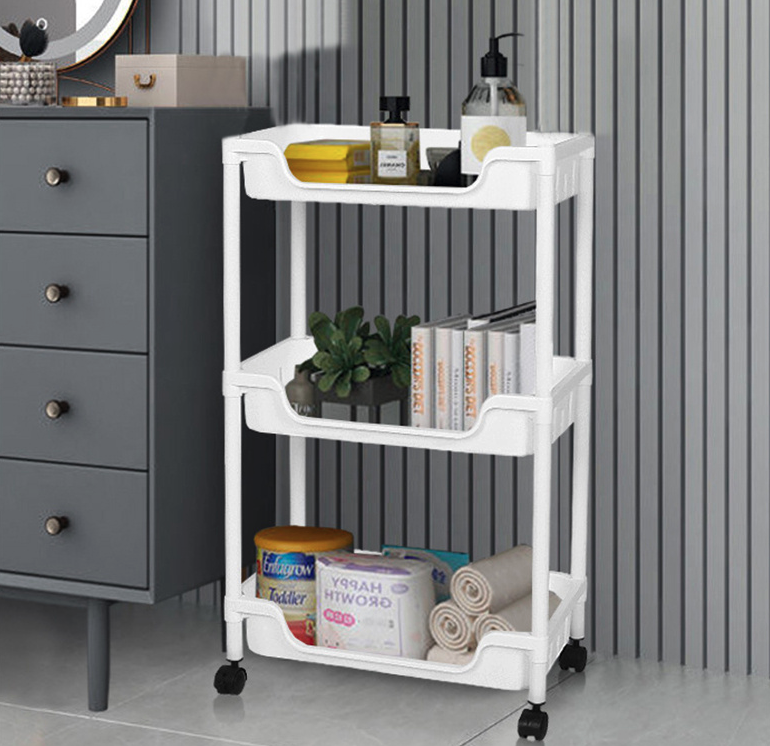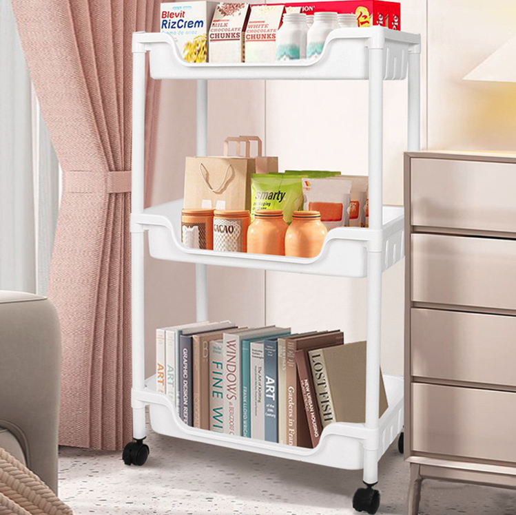 Etajera mobila cu 3 rafturi Material: Plastic Dimensiune: 69x40x22 cm Cum sa stapanesti haosul! Casa ta este mereu plina de haos? Atunci incearca acest carucior dotat cu 3 rafturi, ajuta la depozitarea ordonata a produselor de baie sau a ustensilelor de bucatarie. Intotdeauna gata: nu trebuie sa deschizi si sa inchizi in continuare dulapul din bucatarie pentru a scoate condimentele in timp ce gatesti. Acest raft de bucatarie va va ajuta. Datorita celor 4 roti, va fi langa tine in cel mai scurt timp. Un ajutor de zi cu zi puternic: sustinut de 4 tuburi metalice robuste, fiecare nivel de raft poate rezista la o greutate de pana la 5 kg. Sticle de mancare, bauturi, condimente, chiar si sticle mari de sampon si gel de dus se potrivesc bine pe rafturile din PP rezistente la apa. Asezati fructele si legumele pe rafturile cu decupaje si lasati-le sa „respire”; agatati-va suporturile pentru ustensilele de cele 3 carlige suplimentare pentru un acces usor.