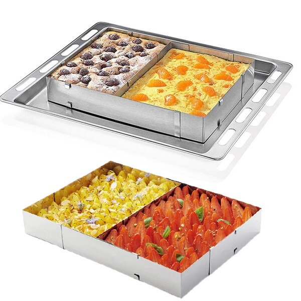 Forma dreptunghiulara pentru tort reglabila Latime reglabila: 18 - 34 cm Lungime reglabila: 28 - 53 cm Inaltime fixa: 5 cm Clemele de pe fiecare parte blocheaza cadrul in dimensiunea dorita. Acest ajutor de bucatarie multifunctional poate fi folosit pentru o mare varietate de retete, de ex. mucegai prajituri si produse de patiserie, cum ar fi pandispan, creme de desert, mousse, placinte, cheesecake, tarte si chiar pizza. Vasul de copt este ideal pentru prajituri de dimensiuni medii dar si pentru creatii XXL si sarbatori de familie de exemplu reuniuni, nunti, cine, zile de nastere, petreceri de Craciun sau orice alte sarbatori cu prietenii si familia. Dupa coacere, puteti folosi vasul de copt ca cadru pentru decorarea prajiturilor, a produselor de patiserie sau a oricarui alt desert. Rama solida pentru tort este realizata 100% din otel inoxidabil si garantat ca nu rugineste. Este usor de curatat si poate fi folosit in frigider si masina de spalat vase. Forma telescopica si reglabila pentru prajituri se poate regla pe lungime pentru a obtine o forma patrat mic, forma patrat mare, forma dreptunghi, si forme intermediare. Forma reglabila telescopica este un produs util, rentabil, ce se poate regla pe lungime si inaltime , poate fi extins sau scurtat, o forma unica ce poate fi transformata, cu usurinta in forme de marimi diferite. Forma poate fi folosita pentru coacere dulciuri, preparate in straturi, mousse-u-ri, deserturi si preparate pe baza de gelatina, produse de patiserie. Forma reglabila poate fi folosita ca forma pentru clatite, taietor pentru prajituri, aluaturi de biscuiti. Forma telescopica este potrivita pentru utilizare in gospodarii casnice, restaurante, cafenele, hoteluri. Forma reglabila are marginile netede si nu raneste mainile, rezistenta la temperaturi ridicate, rezistenta la coroziune, nu este usor de deformat, reutilizabila si usor de curatat. Forma reglabila poate fi ajustata cu usurinta tinand dintr-o parte si tragand din partea opusa spre exterior pentru a se potrivi cu dimensiunea dorita.