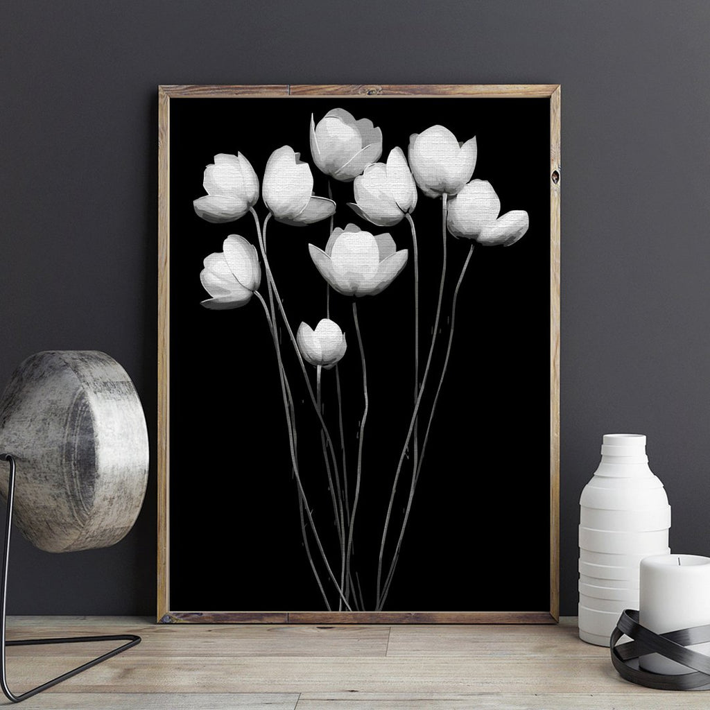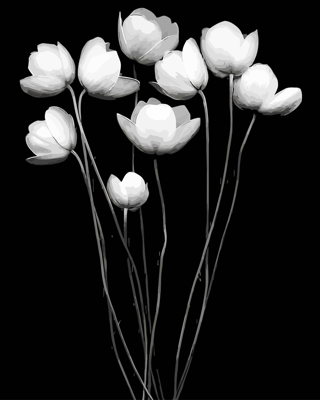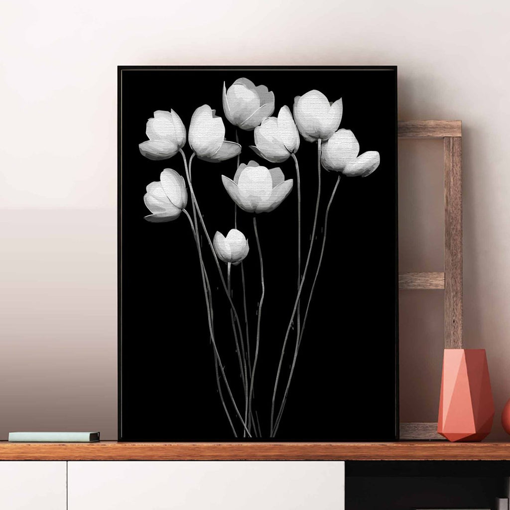 Flori delicate, într-un tablou contrastant, este expresia eleganței prin simplitate. Pictura pe numere Fragile exact despre asta este vorba, frumusețea florilor imortalizată în alb-negru.