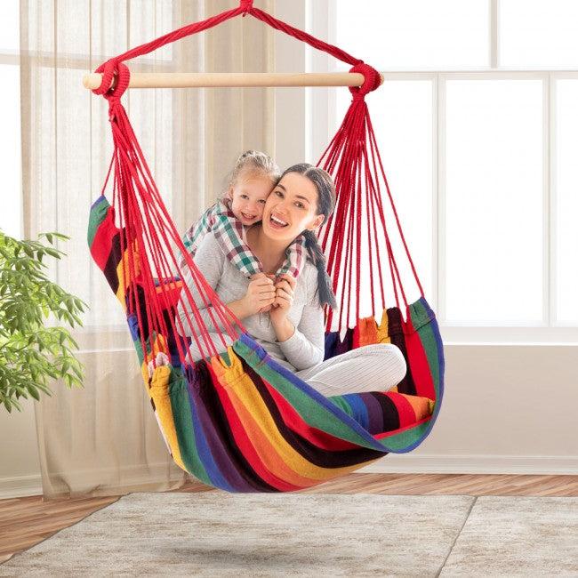 Hamac tip scaun cu bara de lemn 130 x 98 cm Hamac tip scaun foarte confortabil, functional si util in orice gradina, pe un teren sau pe balcon. Este un ragaz perfect pentru un corp obosit, relaxare perfecta. Trebuie doar agatat in gradina sau terasa si va puteti astfel, bucura de aerul curat si de odihna. Hamac suspendat tip scaun Scaun confortabil, mare, suspendat Material respirabil Corzi groase impletite Franghie pentru atarnarea scaunului De ce scaunul suspendat? Visezi o odihna de vara in gradina sau pe terasa? Nu este nimic mai bun decat un scaun brazilian. Este suficient sa-i suspendati capatul unui copac sau sa utilizati un cadru optional pentru a va bucura de activitati in aer liber. Nu ai gradina? Scaunul nostru poate fi folosit cu succes pe terasa, balcon si chiar in apartament. Cea mai buna calitate - Scaunul suspendat este fabricat dintr-un material respirabil placut la atingere, care este, de asemenea, durabil si rezistent la abraziune. In plus, franghiile tesute foarte gros garanteaza ca scaunul va va servi multe sezoane. Specificatii: Sarcina maxima: 150 kg Greutate: aprox 1,1 kg Material: 65% Bumbac / 35% Poliester Lungimea hamacului: 130 cm Latimea hamacului: 98,5 cm Bara de lemn inclusa Pernele nu sunt incluse