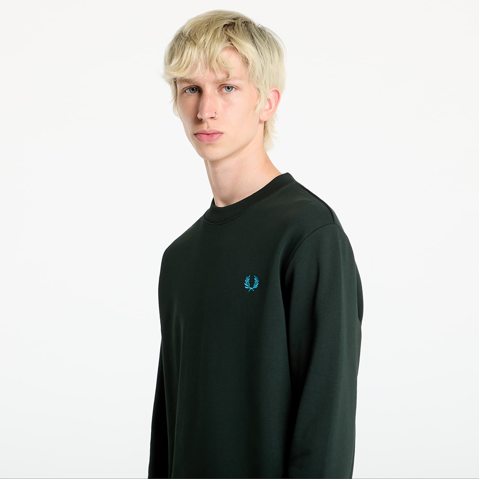 Hanorac FRED PERRY Crew Neck Sweatshirt Night Green/ Ocean pentru 501 lei. Cod produs: M7535 W64, material: 100% Bumbac