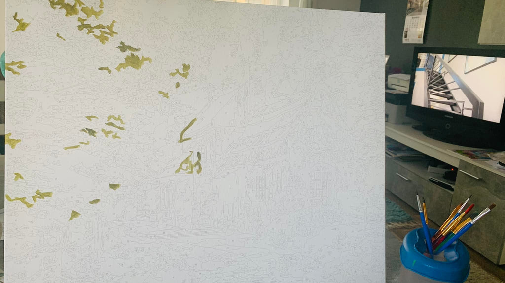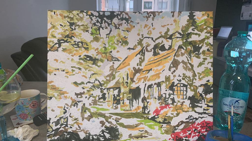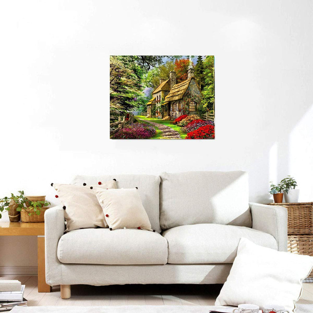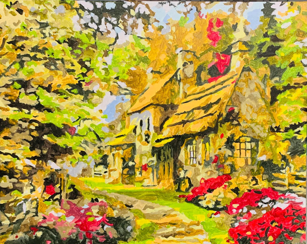 Tabloul cu casa înconjurată de flori și verdeață exprima pasiunea pentru natură și regăsirea într-un loc definit de liniște. O astfel de lucrare artistică pe numere vă evaluează abilitățile, pentru a picta minuțios.