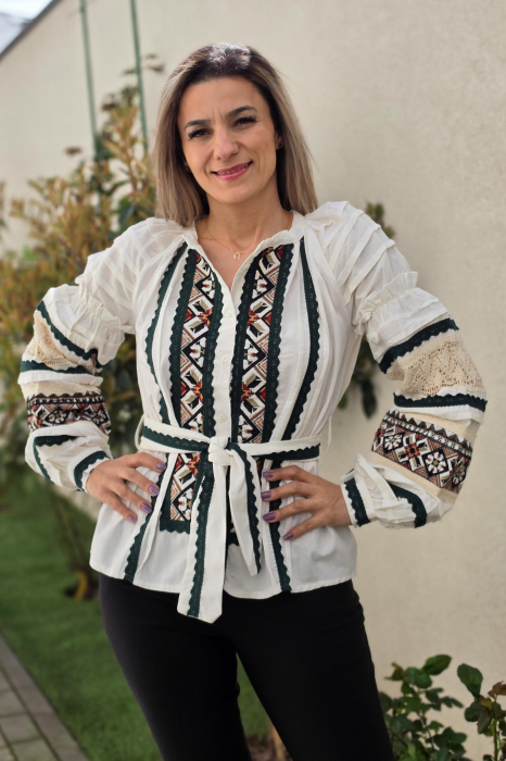 Ie din panza de bumbac 100%, Broderie cusuta la masina. Culoare: alb, crem si negru Marimi disponibile: S -100cm circumferinta bustului, 65 cm lungime, M -105cm circumferinta bustului, 65 cm lungime, L , 110cm circumferinta bustului, 66 cm lungime,...