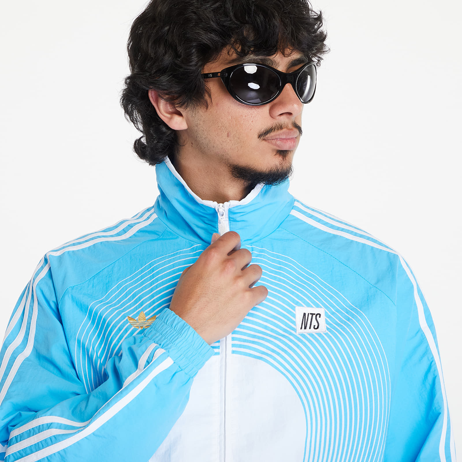 Jacheta adidas x NTS Radio Allover Tracktop Sky Rush pentru 315 lei. Cod produs: JI5143, material: 100% Recyklovaný polyamid ♻