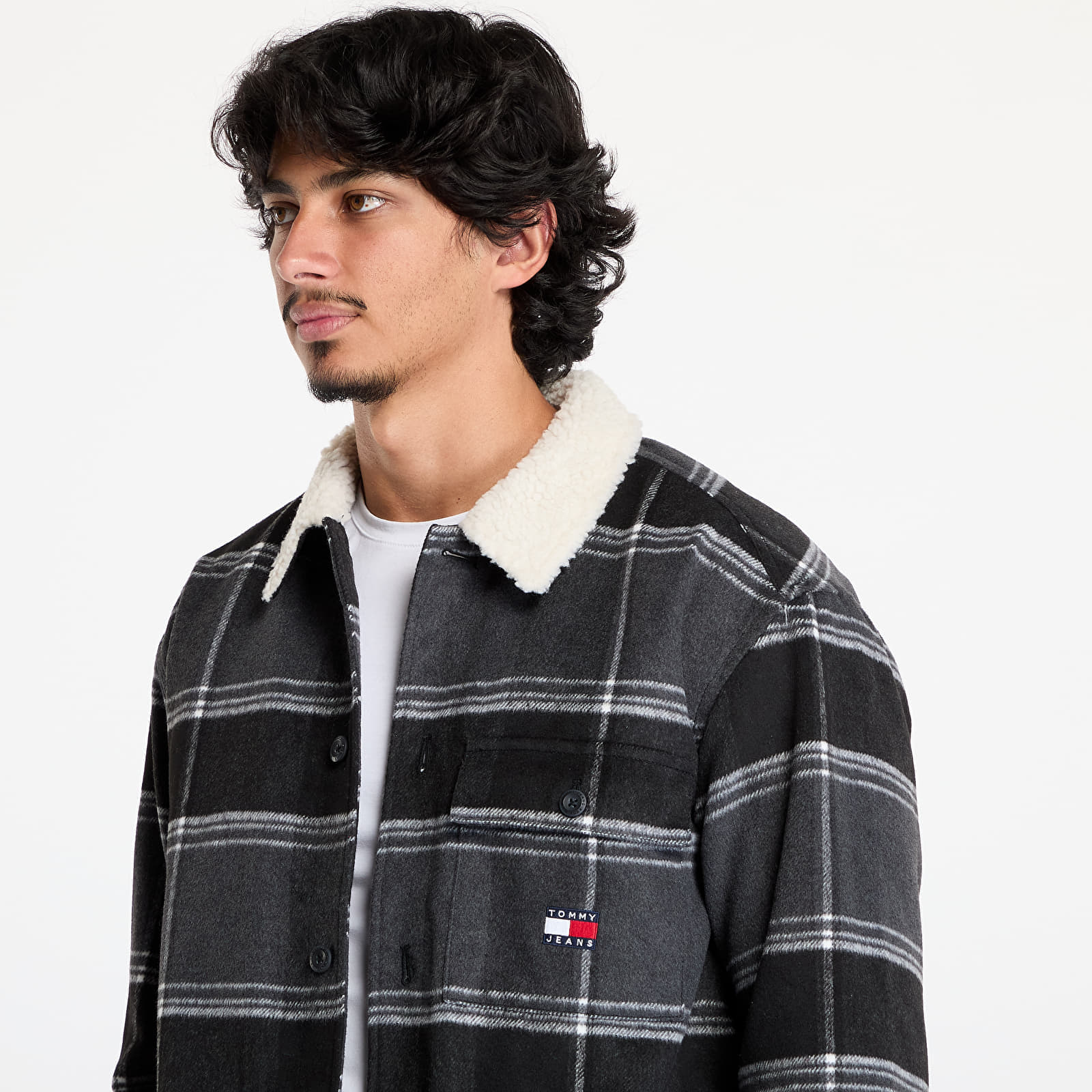 Jacheta Tommy Jeans Check Sherpa Overshirt Black Check pentru 612 lei. Cod produs: DM0DM19652 BDS, material: 5% Poliester / 95% Poliester reciclat