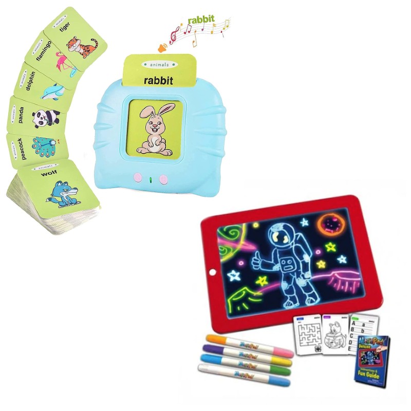 Joc educativ limba engleza + Tableta pentru desen Monitor educativ audio pentru invatarea limbii engleze Culori disponibile: roz si albastru Cartela de iluminare pentru invatare bilingva Carduri audio pentru copii Material: ABS Tensiune: 5V 270mA Rata de putere:1W Baterie Li-ion incorporata: 300 mAh Timp de lucru: 4 ore Incarcare - Cablu USB Tableta desen Magic Pad 8 efecte luminoase Planseta magic Foloseste 3 baterii AAA (Nu sunt incluse) Culoare: Albastru Material: plastic Dimensiune: 20 * 26 cm Continut pachet: 1 x panou 10 x plansa 2 x perie 1 x burete 1 x manualul de instructiuni Nota: Display-uri luminoase de fotografiere si diferite pot cauza culoarea elementului in imaginea un pic diferit de la un lucru Real. Masurarea permis eroare este de +/-1-3 cm. Tipul produsului: Table interactiva