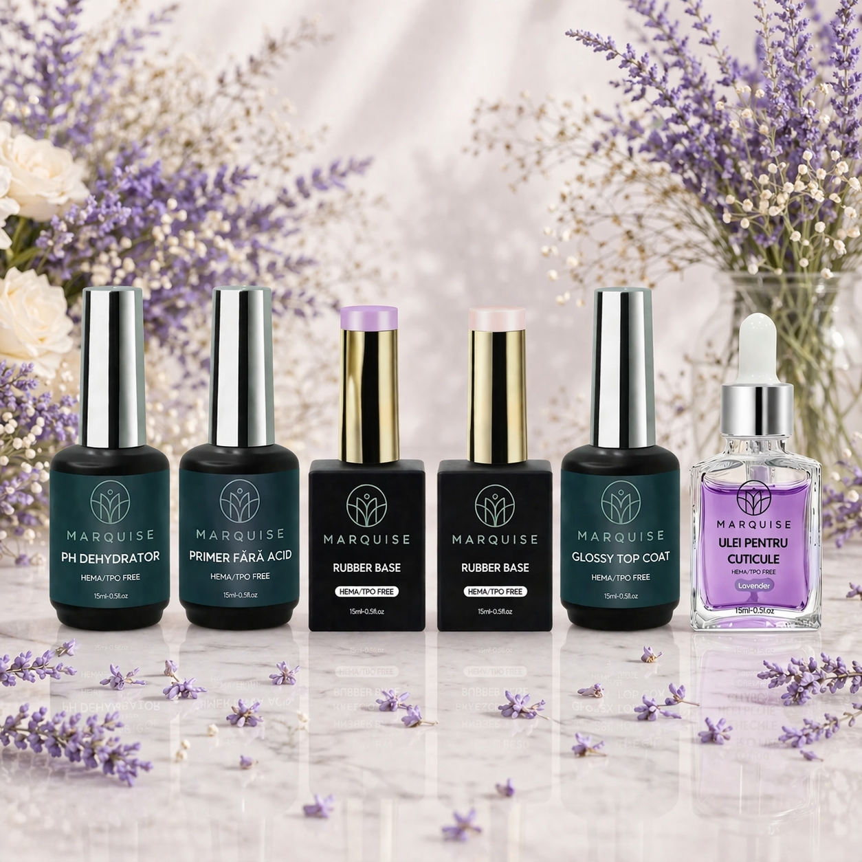 *]:pointer-events-auto scroll-mt-(--header-height) dir=auto data-turn-id=0ef3317f-d55c-4fe1-99c7-4e67956a6705 data-testid=conversation-turn-19 data-scroll-anchor=false data-turn=user> *]:pointer-events-auto scroll-mt-[calc(var(--header-height)+min(200px,max(70px,20svh)))] dir=auto data-turn-id=request-WEB:1dad9ed6-584b-424b-8f90-632db7a34df6-9 data-testid=conversation-turn-20 data-scroll-anchor=true data-turn=assistant> Look premium direct acasă.. Setul Marquise include produsele esențiale pentru realizarea unei manichiuri rezistente, cu aspect natural și luciu intens. Formulele HEMA/TPO FREE sunt concepute pentru a fi mai delicate cu unghia naturală, oferind în același timp aderență excelentă și durabilitate îndelungată. Setul conține produse pentru pregătirea unghiei, aplicarea bazei și sigilarea manichiurii, dar și un ulei pentru îngrijirea cuticulelor, pentru un rezultat final impecabil. Conținut set: PH Dehydrator HEMA/TPO FREE Marquise – 15 ml Primer fara acid HEMA/TPO FREE, Marquise, 15 ml Rubber Base HEMA/TPO FREE, Marquise, Cover - Lila Rubber Base HEMA/TPO FREE, Marquise, Cover - Nude Top Coat Glossy HEMA/TPO FREE, Marquise Ulei de cuticule cu pipetă Lavender, Marquise, 15 ml Mod de aplicare: Pregătește unghia – matifiază ușor suprafața unghiei și îndepărtează praful. Aplică PH Dehydrator pentru degresarea și pregătirea unghiei. Aplică Primer fără acid și lasă-l să se usuce câteva secunde. Aplică Base Coat , apoi polimerizează în lampă LED 60 sec / UV 120 sec . Aplică oja semipermanentă în 1–2 straturi, polimerizând fiecare strat. Sigilează cu Top Coat Glossy și polimerizează pentru luciu și rezistență. Rezultatul: o manichiură elegantă și rezistentă până la 3–4 săptămâni .