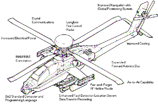 Apache este cu siguranta cel mai puternic si sofisticat elicopter de lupta datorita fuselajului sau robust, proiectat fara a se economisi costuri, precum si echipamentului electronic remarcabil si sistemelor masive de armament. In prezent, se efectueaza modificari pentru a adapta modelul D echipat cu radar Longbow. Acest lucru permite o mai mare eficienta in utilizarea rachetelor antitanc si o capacitate mai mare de a directiona puterea de foc.