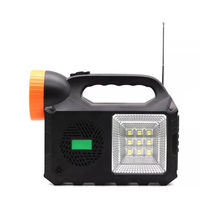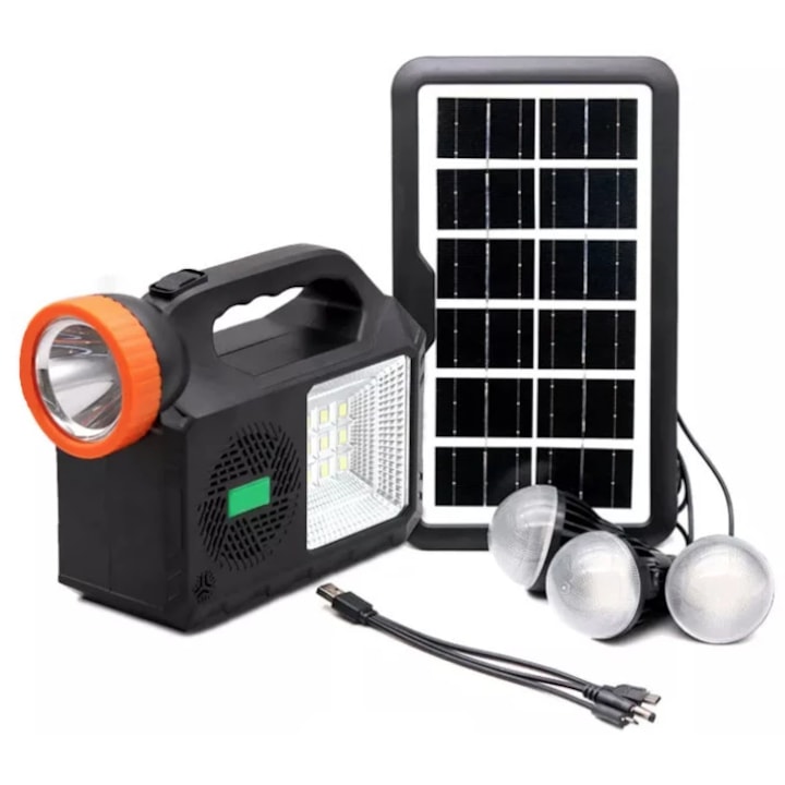 Kit solar iluminare GD-102, 3 becuri Boxa Bluetooth, Radio FM, putere 80 W Sistemul cu incarcare solara pentru alimentare si iluminare este solutia ideala pentru situatiile in care nu dispuneti de energie electrica. Fie ca sunteti intr-o zona izolata, in camping sau in timpul unei pene de curent, kit-ul solar va ofera toate facilitatile de care aveti nevoie: iluminat portabil prin intermediul celor 3 becuri cu LED-uri, ajutorul lampii LED si incarcarea telefoanelor mobile si alte dispozitive de la acumulatorul de 6V inclus in sistem. Becurile se alimenteaza direct de la acumulatorul sistemului si pot fi utilizate ca lampi de veghe. Datorita sistemului special de agatare (snur), acestea pot fi usor montate in fata cortului, atunci cand sunteti in camping. Cand nu utilizati sistemul, asigurati-va ca acesta este oprit. Reincarcati sistemul de fiecare data cand intensitatea luminii becurilor scade. Nu permiteti descarcarea totala, altfel durata de viata a acumulatorului este drastic diminuata. Caracteristici: Model: GD-102 Functii: iluminare, boxa cu Bluetooth, radio, powerbank 2 x Intrare USB 5V Alimentare: solara Tensiune acumulator: 6V Timp de incarcare acumulator: 8-10 ore Timp de operare: 6-10 ore Tip bec: LED Capacitate baterie: 5000 mAh Conectivitate: MP3, FM Radio, Bluetooth, card TF Putere incarcare panou solar: 3.8W Timp incarcare panou solar: 8-10 ore Putere: 80W Pachetul include: 1 x Boxa/Acumulator/Lanterna 3 x Becuri LED 1 x Panou solar 1 x Cablu de incarcare 3 in 1