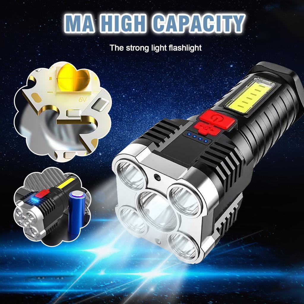 Lanterna de mana 5 LED + 1 LED COB lateral Super luminoasa, 1200 mAh, incarcare USB, afisaj baterie Material: ABS Dimensiune: aproximativ 6 x 6 x 15 cm Capacitate baterie: 1200 mAh Sursa de alimentare: incarcare USB Forma sursei de lumina: LED Mediu aplicabil: drumetii, camping, pescuit, etc.