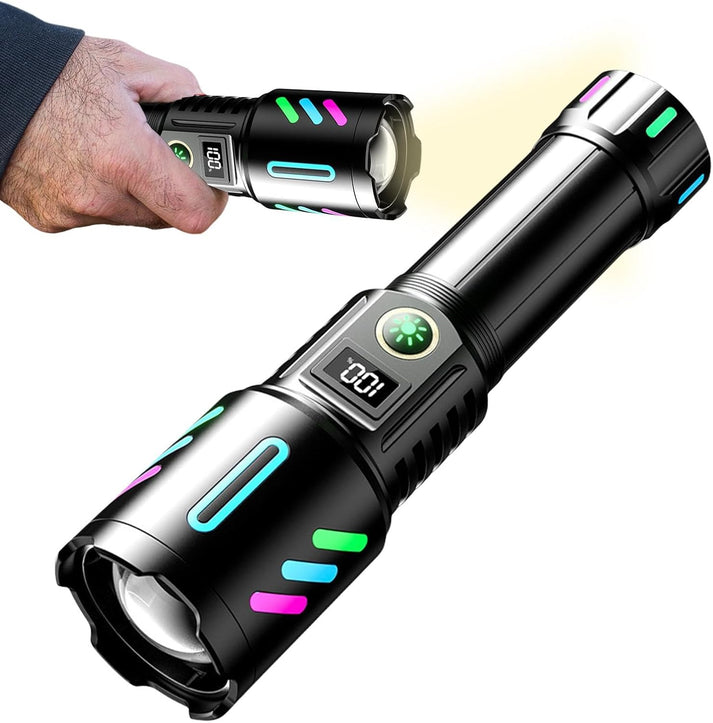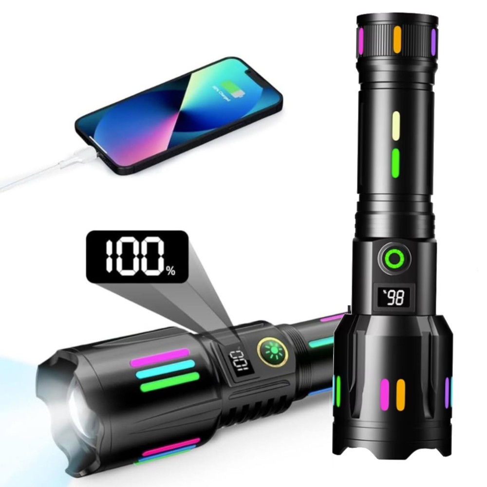 Lanterna puternica de mana P50 Lanterna LED tactica portabila, IPX6 5 moduri, zoom, raza de actiune 1000 metri Indicator baterie si display Rezistenta la socuri Distanta focala: reglabila Zoom: Da Distanta de iluminare: 1000 metri Putere: 30 W Culoare LED: alb Impermeabil: Da Lumen: 1200 Mod comutare: SOS Material caroserie: aliaj de aluminiu Model de margele LED: P50 Incarcator: reincarcabil Capacitate baterie: 3000 mAh Culoare carcasa: negru Impermeabil: da Caracteristica: flashlihgt puternic zoomabil Mod de iluminare: 5 moduri Metoda de zoom: reglabil