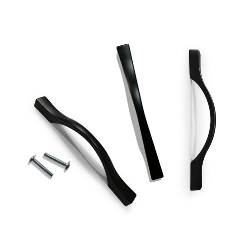 Manere metalice negre. Pretul este pentru 40 de bucati. Include suruburi pentru prindere pe frontul de mobila (usa sau sertar) de 18 mm. CARACTERISTICI Distanta intre gauri: 96 mm Greutate: 23 grame