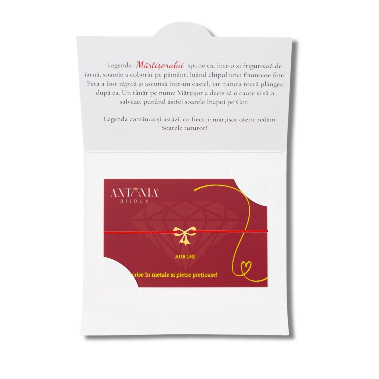 Mărțișor tip Brățară - Fundița din AUR Cu Mărțișorul tip Brățară - Fundița din AUR, aduci o notă de eleganță și rafinament fiecărei ținute. Acest accesoriu din colecția Martisoare Aur Antonia îmbină tradiția cu modernitatea, perfect pentru a sărbători sosirea primăverii. Realizat din aur de 14K, acest simbol al primăverii adaugă un strop de strălucire și rafinament stilului tău. Dimensiuni compacte: figurina de 0.9x0.7 cm Design elegant și versatil Aur de 14K pentru durabilitate și strălucire Șnur roșu reglabil pentru confort zilnic Ideal pentru utilizare zilnică sau ocazii speciale Specificații Produs Dimensiunile figurinei sunt de 0.9x0.7 cm, iar greutatea este de aproximativ 0.08g. Brățara este echipată cu un șnur roșu reglabil, potrivit pentru mărimea standard a unui adult. Fiecare piesă este atent ambalată pentru a oferi o experiență plăcută de la primul contact. Caracteristici Cheie & Beneficii Mărțișorul tip brățară oferă dimensiuni compacte și un design elegant, aducând rafinament oricărei ținute. Fabricat din aur de 14K, se remarcă prin durabilitate și o strălucire deosebită. Reglabilitatea brățării asigură confort și adaptabilitate zilnică. Utilizare & Aplicații Acest mărțișor este ideal pentru utilizare zilnică sau la ocazii speciale, aducând un plus de eleganță. Este potrivit atât pentru femei, cât și pentru bărbați, datorită designului său versatil și elegant. Este un cadou excelent pentru cei dragi, fiind un simbol al primăverii și al eleganței. Materiale Folosite Realizat din aur de 14K, bijuteria este durabilă și strălucitoare. Aurul, un simbol al bogăției și valorii, are un impact pozitiv asupra stării de spirit. Șnurul roșu adaugă un contrast plăcut și tradițional, subliniind frumusețea aurului. Mărțișorul tip Brățară - Fundița din AUR este alegerea perfectă pentru cei care apreciază eleganța și tradiția. Cu un design rafinat și materiale de înaltă calitate, îți oferă nu doar frumusețe, ci și durabilitate. Alege acest accesoriu deosebit pentru a transforma orice ocazie într-un moment special. * Prețul standard afișat pe site este prețul de bază al bijuteriei, fără alte opțiuni extra, opțiuni ce se pot selecta din pagina de produs (doar unde este cazul) și generează cost suplimentar. Prețurile includ TVA și sunt actualizate periodic pentru a reflecta fluctuațiile pieței metalelor prețioase. * Garanție: Card și Certificat de garanție electronic pentru întreaga comandă. Garanția acoperă defectele de fabricație, dar nu include uzura normală, zgârieturi sau daune cauzate de utilizarea necorespunzătoare a produsului. * Personalizarea este posibilă doar la piesele ce permit acest lucru, iar prețul standard selectabil în pagina de produs face referire la personalizare simplă cu text sau simbol. Pentru alte opțiuni de personalizare mai complexă, prețul va fi comunicat telefonic sau prin e-mail. Produsele personalizate nu pot fi returnate, cu excepția cazurilor de defecte din fabricație. * Fotografiile, gramajele și dimensiunile sunt prezentate cu titlu orientativ, iar în realitate culorile pot fi ușor diferite, iar specificațiile privind mărimea și greutatea pot varia ușor în funcție de tipul de finisaj aplicat. Variabilitatea poate fi cauzată și de procesele de producție manuală. * Din dorința de a surprinde cât mai bine detaliile bijuteriei, este posibil ca în fotografie unele piese să pară mai mari sau mai mici decât în realitate. Recomandăm verificarea specificațiilor detaliate din descrierea produsului. * Rareori informațiile prezentate pe site pot conține mici greșeli în titlu, descriere sau specificații. În cazul afișării unui preț derizoriu, evident dintr-o eroare umană sau tehnică, ne rezervăm dreptul să nu expediem produsul respectiv și să contactăm clientul pentru rectificare. * Livrarea produselor se face în ambalaje sigilate, cu certificate de autenticitate incluse. În cazul în care coletul ajunge deteriorat, vă rugăm să ne contactați în maximum 24 de ore pentru soluționare. * Produsele achiziționate online pot fi returnate conform legislației în vigoare, cu excepția produselor personalizate, care nu pot fi returnate decât în cazul defectelor de fabricație.