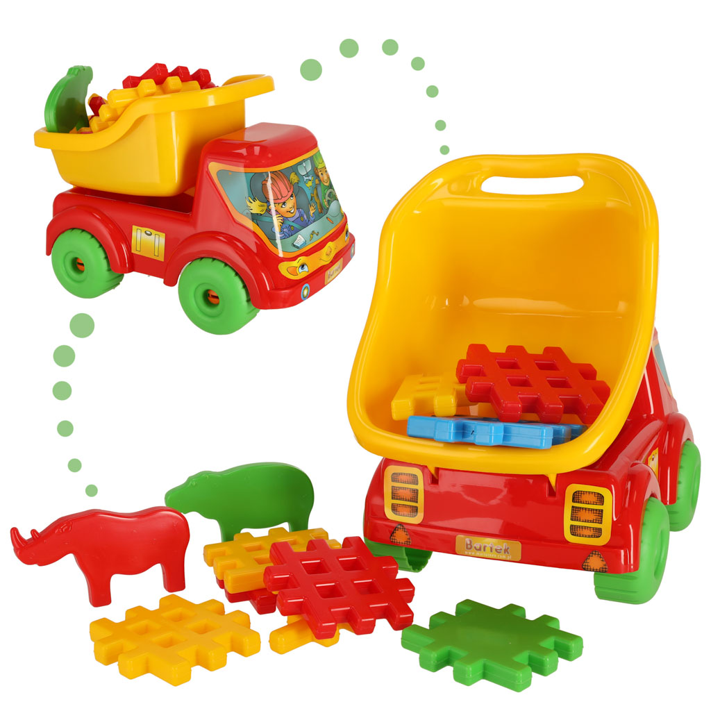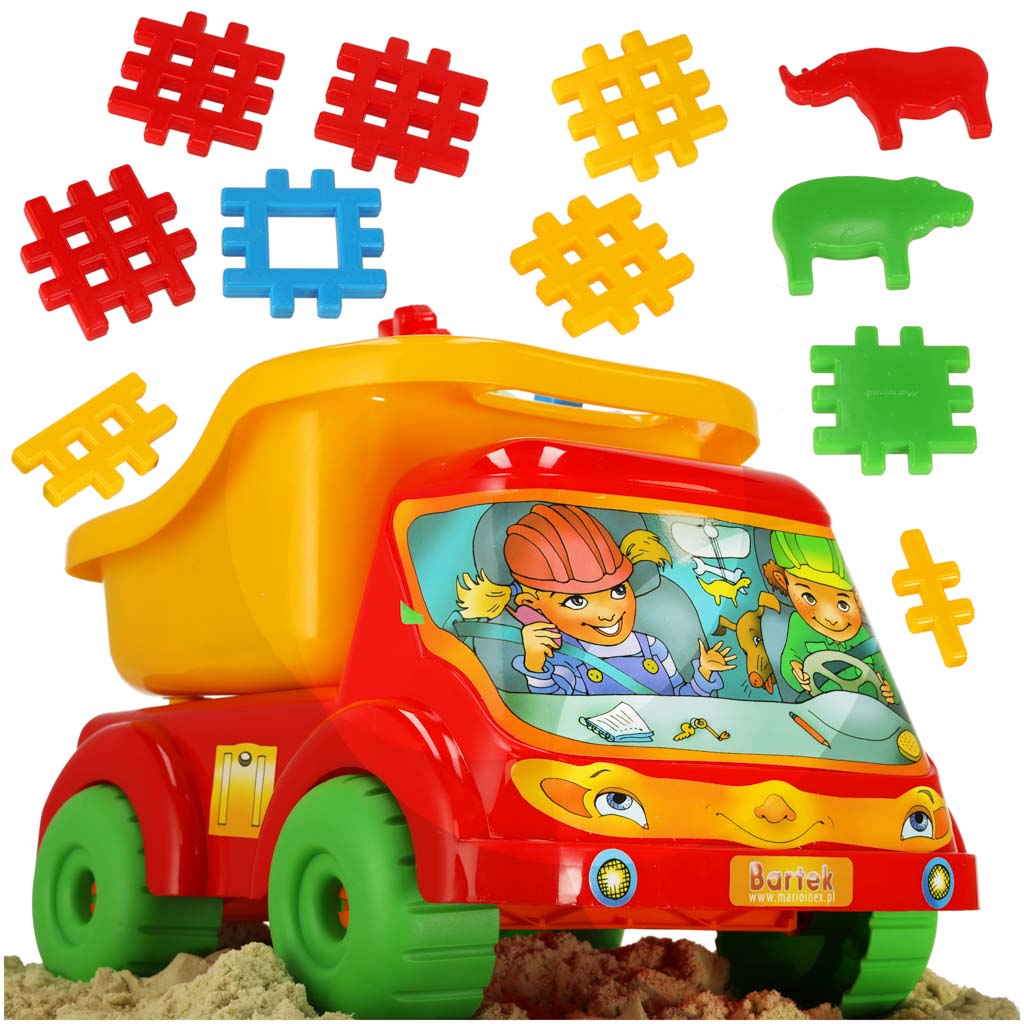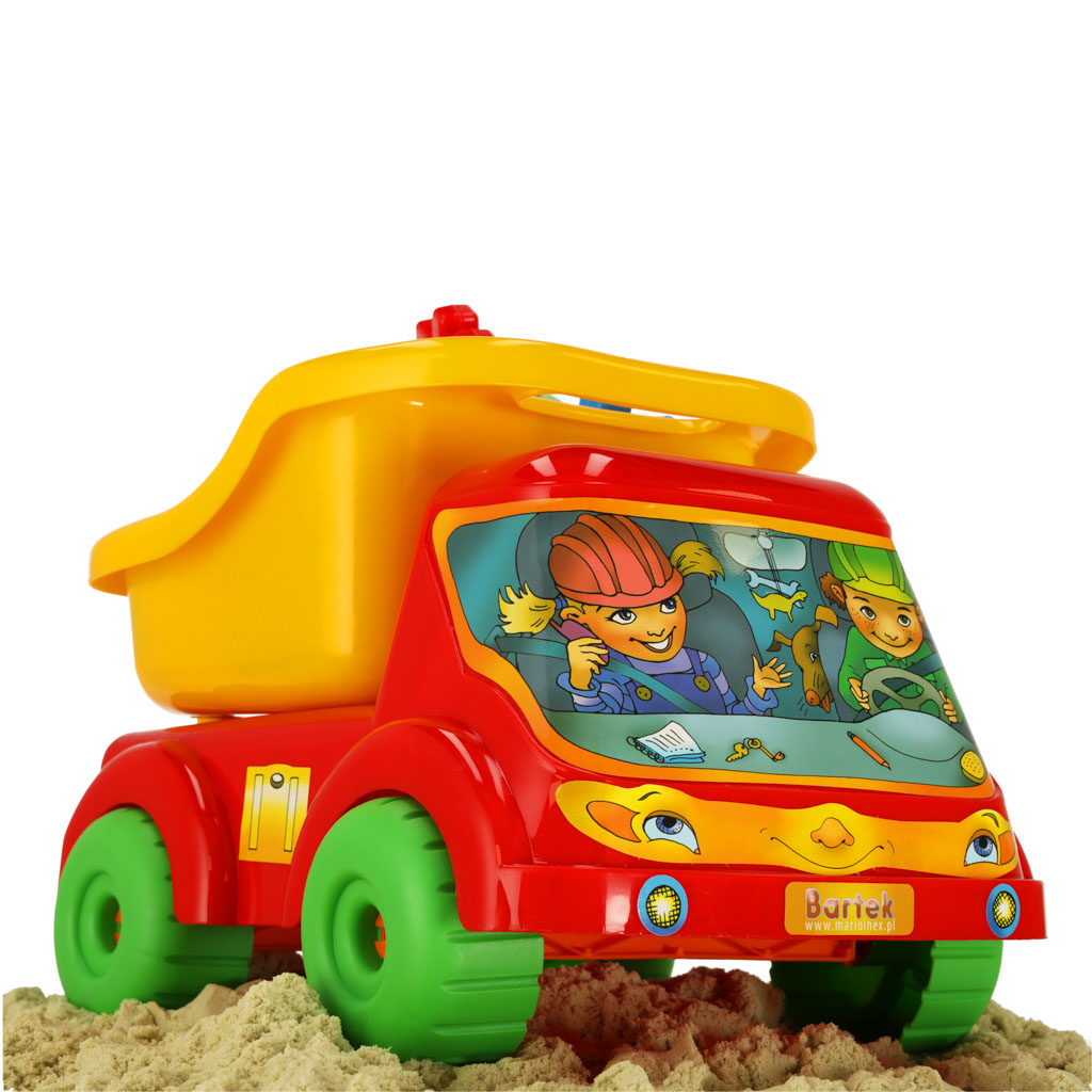 Camion basculant Bartek + accesorii pentru nisip - In set veti gasi 8 elemente. - Dimensiunea pachetului: 35 cm x 25 cm x 23,5 cm. - Potrivit pentru copii cu varsta de peste 24 de luni. - Indepartati elementele din ambalaj inainte de a da jucaria copilului dumneavoastra. - Culorile pieselor pot fi diferite de cele prezentate pe ambalaj. - Intretinere: produsul poate fi curatat cu o carpa umeda.