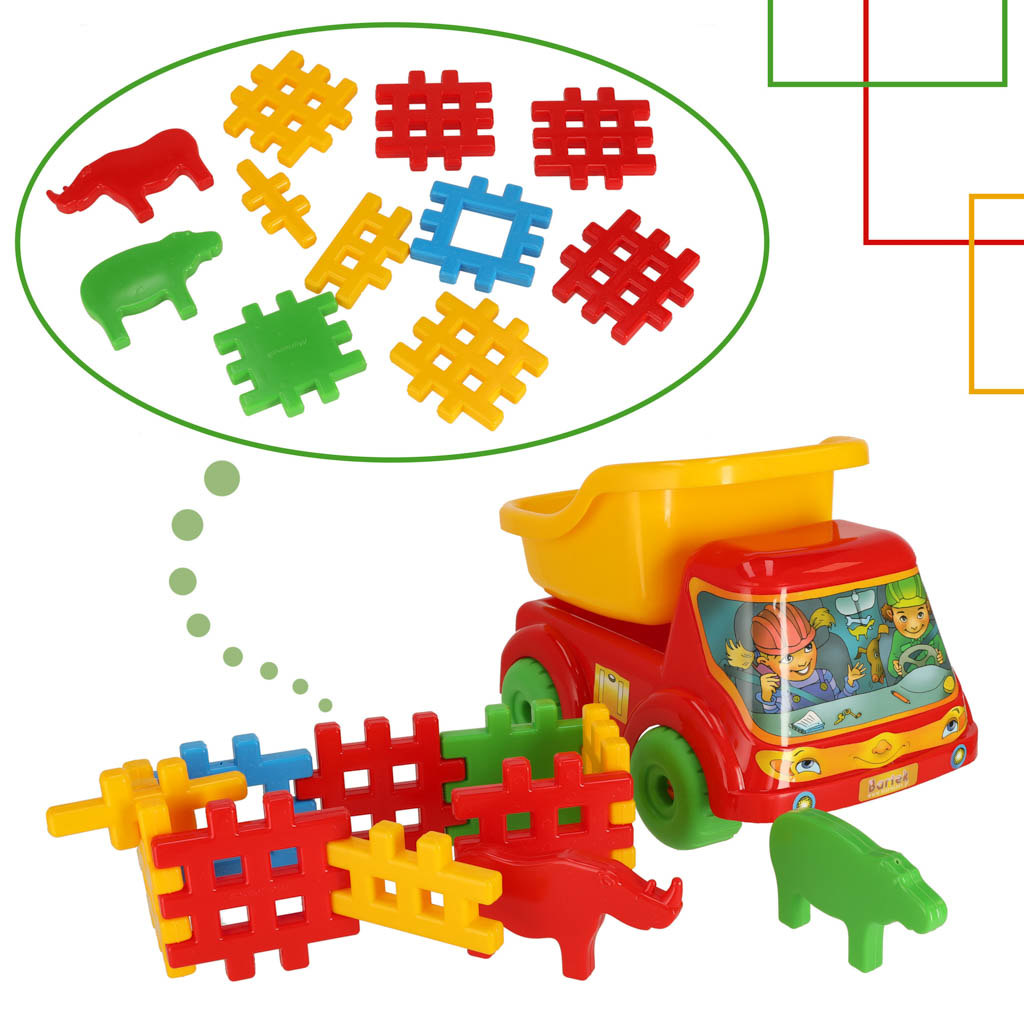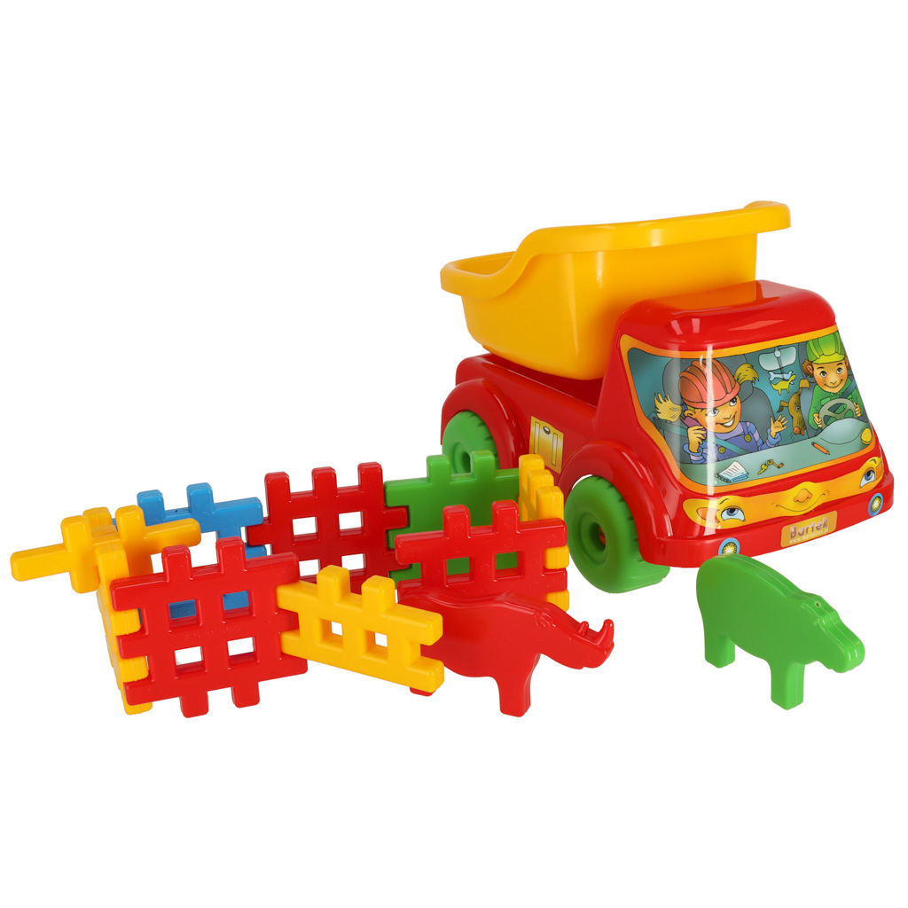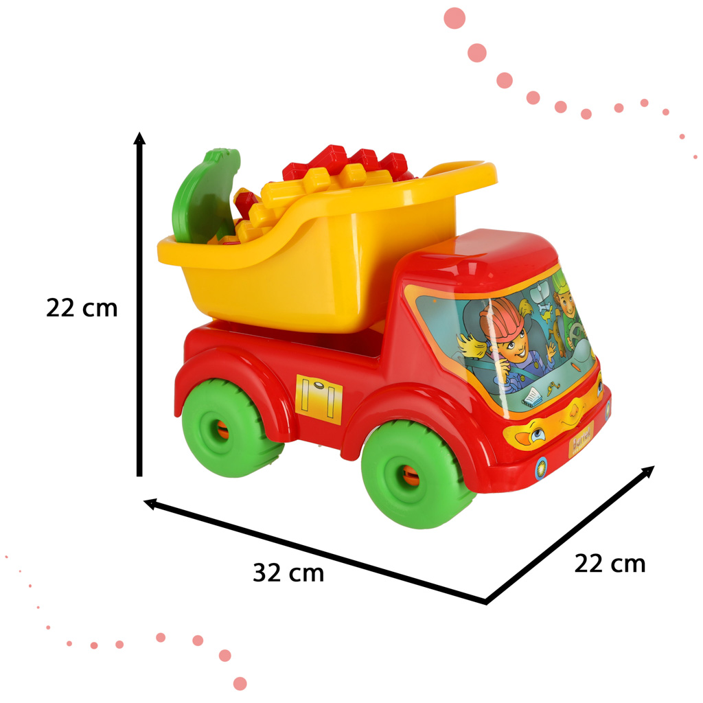 Camion basculant Bartek + accesorii pentru nisip - In set veti gasi 8 elemente. - Dimensiunea pachetului: 35 cm x 25 cm x 23,5 cm. - Potrivit pentru copii cu varsta de peste 24 de luni. - Indepartati elementele din ambalaj inainte de a da jucaria copilului dumneavoastra. - Culorile pieselor pot fi diferite de cele prezentate pe ambalaj. - Intretinere: produsul poate fi curatat cu o carpa umeda.