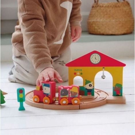 Tren cu sine si statie Brand: Djeco Descriere Un set de tren din lemn perfect pentru copiii foarte mici, ideal pentru primele scenarii de joaca. Cei mici pot impinge locomotiva si vagonul conectate prin magnet, urmarind traseul sinelor din lemn. Trenul ajunge in statie, unde clopotelul metalic suna pentru a-l alerta pe conductor, transformand joaca intr-o experienta interactiva si plina de imaginatie. Copiii pot inventa povesti, pot imita sunetele trenului si pot descoperi bucuria jocului simbolic. Caracteristici ✔ Contine: 7 sine (cerc cu diametrul aprox. 29 cm), locomotiva, vagon cu prindere magnetica, casuta cu clopotel metalic, 2 accesorii ✔ Varsta recomandata: 18 luni+✔ Material: lemn cu vopsele non-toxice ✔ Compatibil cu sine standard ✔ Conform standardelor EN71 & ASTM ✔ Curatare: cu carpa moale, usor umeda Beneficii ✔ Stimuleaza imaginatia si jocul de rol ✔ Ajuta la dezvoltarea motricitatii fine ✔ Contribuie la coordonarea mana–ochi ✔ Incurajeaza povestirea si creativitatea ✔ Materiale sigure si placute la atingere pentru copiii mici Specificatii tehnice ✔ Locomotiva si vagon cu sistem magnetic ✔ Clopotel metalic integrat in statie ✔ Lemn durabil, prelucrat cu finisaje netede ✔ Sine compatibile cu majoritatea seturilor standard Djeco este un brand recunoscut international pentru calitatea exceptionala a jucariilor sale din lemn, create special pentru a sustine dezvoltarea armonioasa a copiilor mici. Acest set de tren reuseste sa imbine simplitatea, siguranta si farmecul clasic al trenulețelor, fiind alegerea ideala pentru primele experiente de joaca structurata si imaginativa. AVERTISMENTE ⚠️ Contraindicat copiilor mai mici de 18 luni . Nu lasati ambalajele jucariilor/produselor la indemana copiilor. Indepartati orice ambalaj al jucariei/produsului inainte de a da jucaria/produsul copilului. Va rugam sa supravegheati copilul in timp ce se joaca/foloseste acest produs. Pastrati instructiunile si etichetele pentru referinte viitoare. Pastrati jucaria/produsul departe de foc; feriti jucaria/produsul de temperaturi ridicate si umiditate.