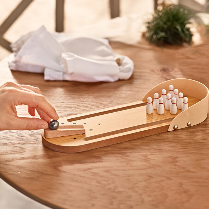 Mini Set Bowling cu minge si suport 29.5 x 10 cm, 4 - 10 ani, material lemn masiv Esti pregatit pentru un joc palpitant de bowling? Esti liber sa castigi oriunde si oricand! Oare vei reusi sa darami toate popicele dintr-o singura lovitura? jocul dezvolta spiritul competitiv jocul contribuie la dezvoltarea coordonarii si a indemanarii jocul in miniatura este realizat din lemn bine finisat include accesoriile necesare de care ai nevoie Setul include: mini pista de bowling cu marcaje lansator rotativ, panou curbat 10 mini popice o bila metalica Dimensiune pista: 32 cm (lungime) x 9.5 (latime) Dimensiune popica: 3 cm Dimensiune ambalaj: 32 x 10 x 4 cm Varsta recomandata: 4 ani+ Acest mini set de jocuri de bowling este atat de mic incat este chiar si cea mai mica jucarie de bowling din lume. Este usor de transportat si poate fi jucat oricand in interior si in aer liber. Acest joc de masa este, de asemenea, un mini joc de masa pentru birou si un joc de masa pentru adulti la serviciu. Acest joc de bowling de birou este o jucarie pentru ameliorarea stresului, care poate fi folosita ca un cadou pentru reducerea stresului pentru femei si barbati la birou, cadou pentru ameliorarea stresului de birou pentru adulti si cadou pentru ameliorarea stresului pentru femei si barbati. Cand va simtiti stresat sau anxios la locul de munca, jocul la acest flipper va poate usura si elibera stresul, permitandu-va sa continuati sa lucrati cu usurinta. Acesta este un joc distractiv de miscare a degetelor pe care il puteti juca pe desktopul de la birou, pe desktopul de acasa sau pe masuta de cafea. Simplu si usor de jucat - Tot ce trebuie sa faceti este sa ridicati zece mini ace de bowling, sa pozitionati rampa in directia dorita si sa lasati bilele sa se rostogoleasca in jos. Suprafata foarte neteda si foarte usor de jucat. Jocul de mini bowling este usor de jucat, dar provocator pentru toata lumea, la familie si prieteni, la birou sau la petrecere. Pastreaza-ti timpurile bune oriunde mergi, deoarece este suficient de mic si compact pentru a-ti lua cu tine oriunde ai merge.