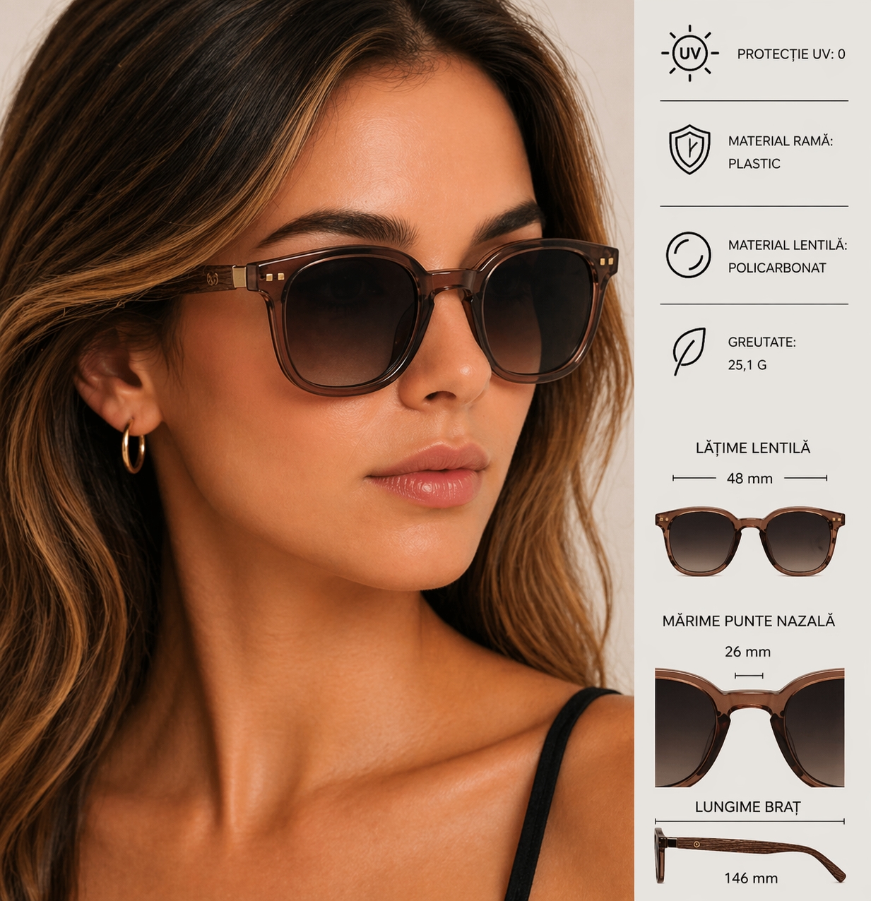 protectie UV: 0 material rama: plastic; material lentila: policarbonat; latime lentila: 48 mm; marime punte nazala: 26 mm; lungime brat: 146 mm; greutate: 25,1 g. Important : A se evita socurile termice si mecanice, zgarierea, contactul cu alcool, parfum, acetona, detergent, suprafete abrazive.