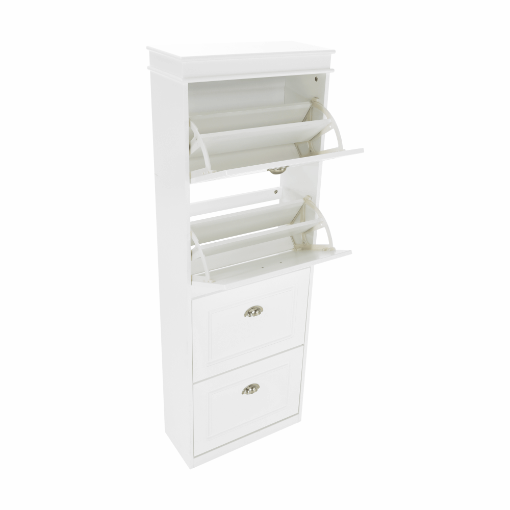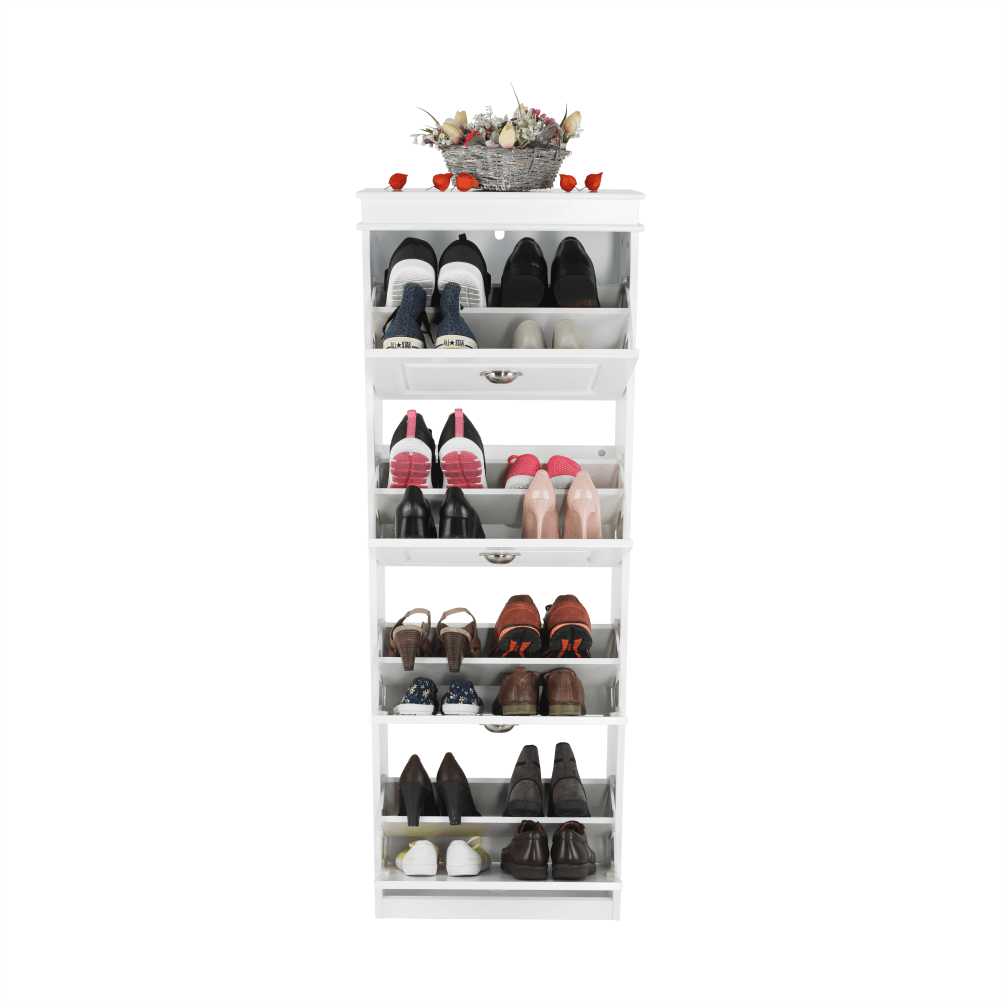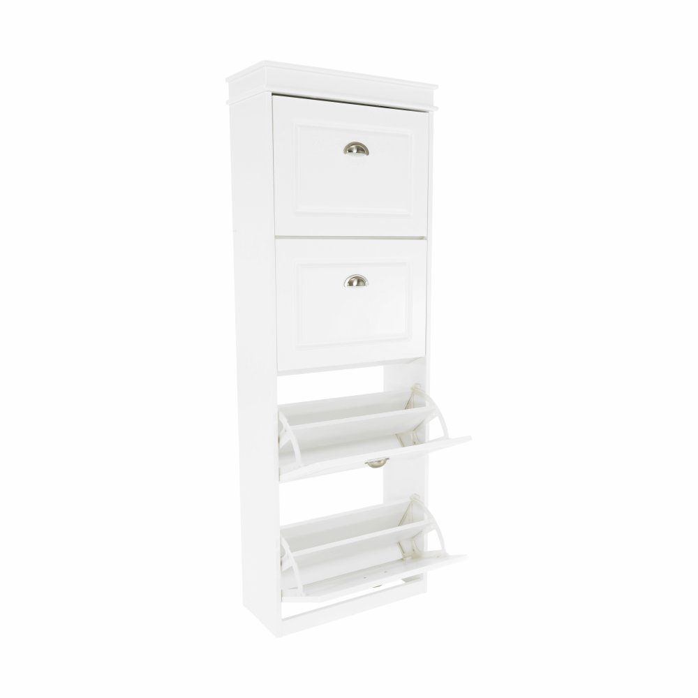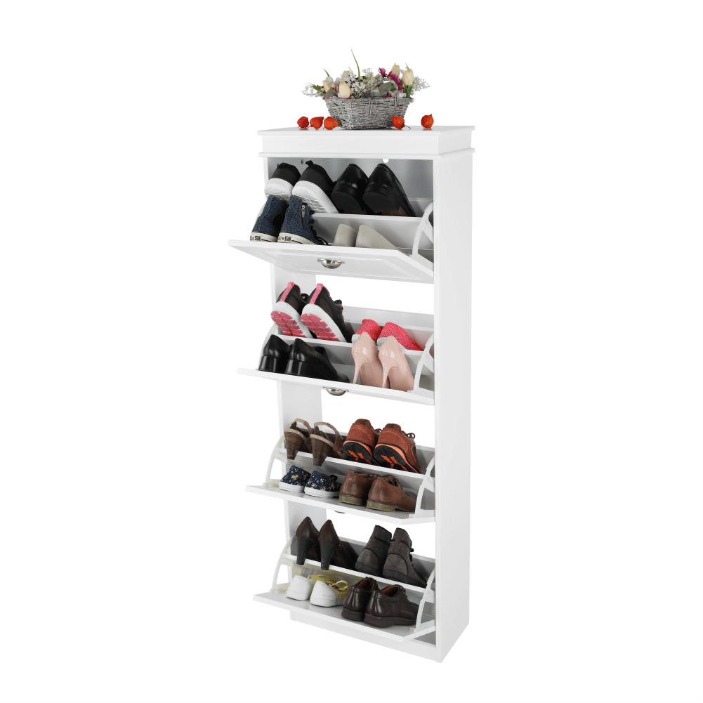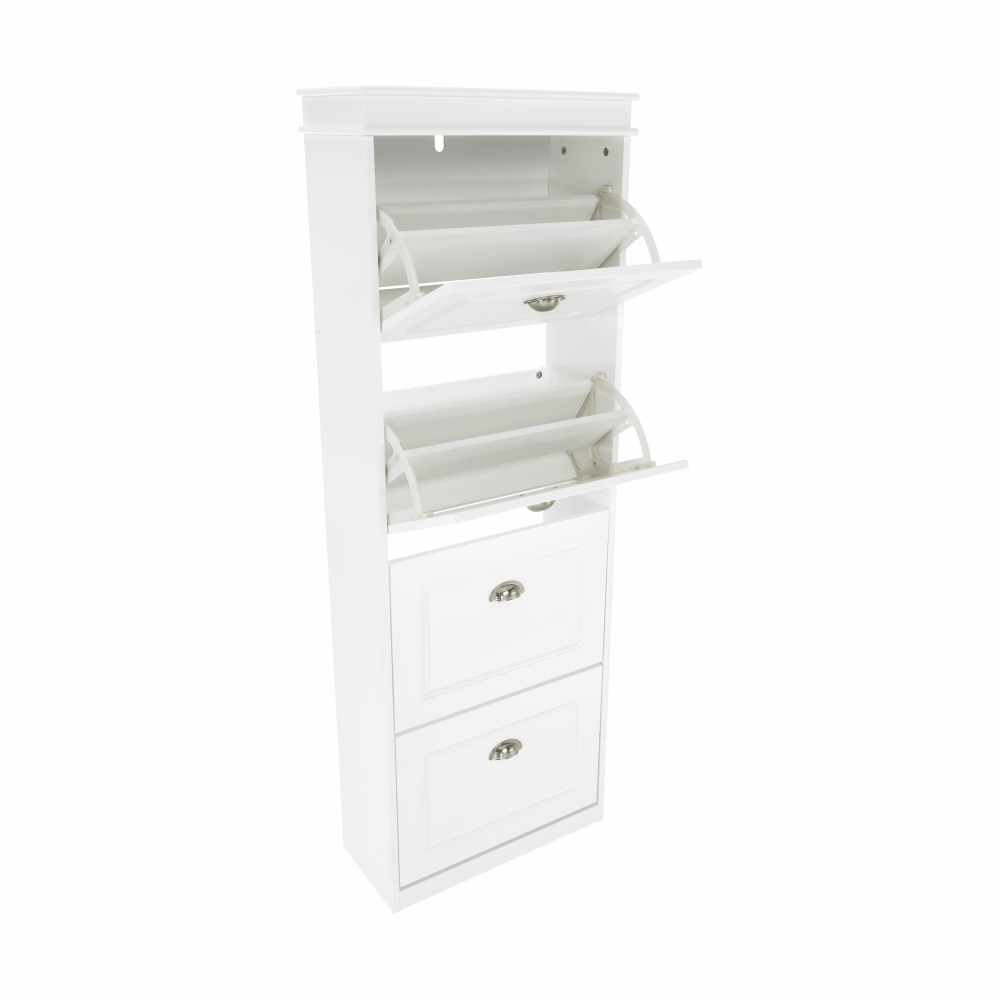 Pantofar SEBER TYP 3,Culoare: alb/griMaterial: MDF/PALDimensiuni (lxhxA): 53,5x152x24 cm4 compartimentePotrivit pentru 16 perechi de pantofiRafturi inclinateGreutate: 25,2 kgGreutate sustinuta: 90 kg