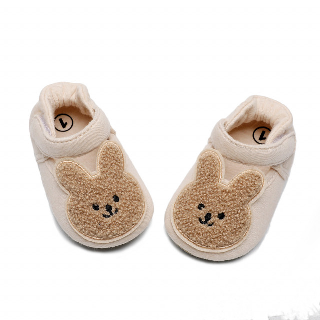 Marimi: 3-6 luni (lungimea talpitei: la interior - 10,5 cm; la exterior - 11 cm) 6-9 luni (lungimea talpitei: la interior - 11,5 cm; la exterior - 12 cm) 9-12 luni (lungimea talpitei: la interior - 12,5 cm; la exterior - 13 cm) Pantofiori pentru fetite din material textil, cu un iepuras aplicat in fata. Se inchid cu bareta cu arici intr-o parte. Culoare: crem Talpa: cauciuc moale si flexibil