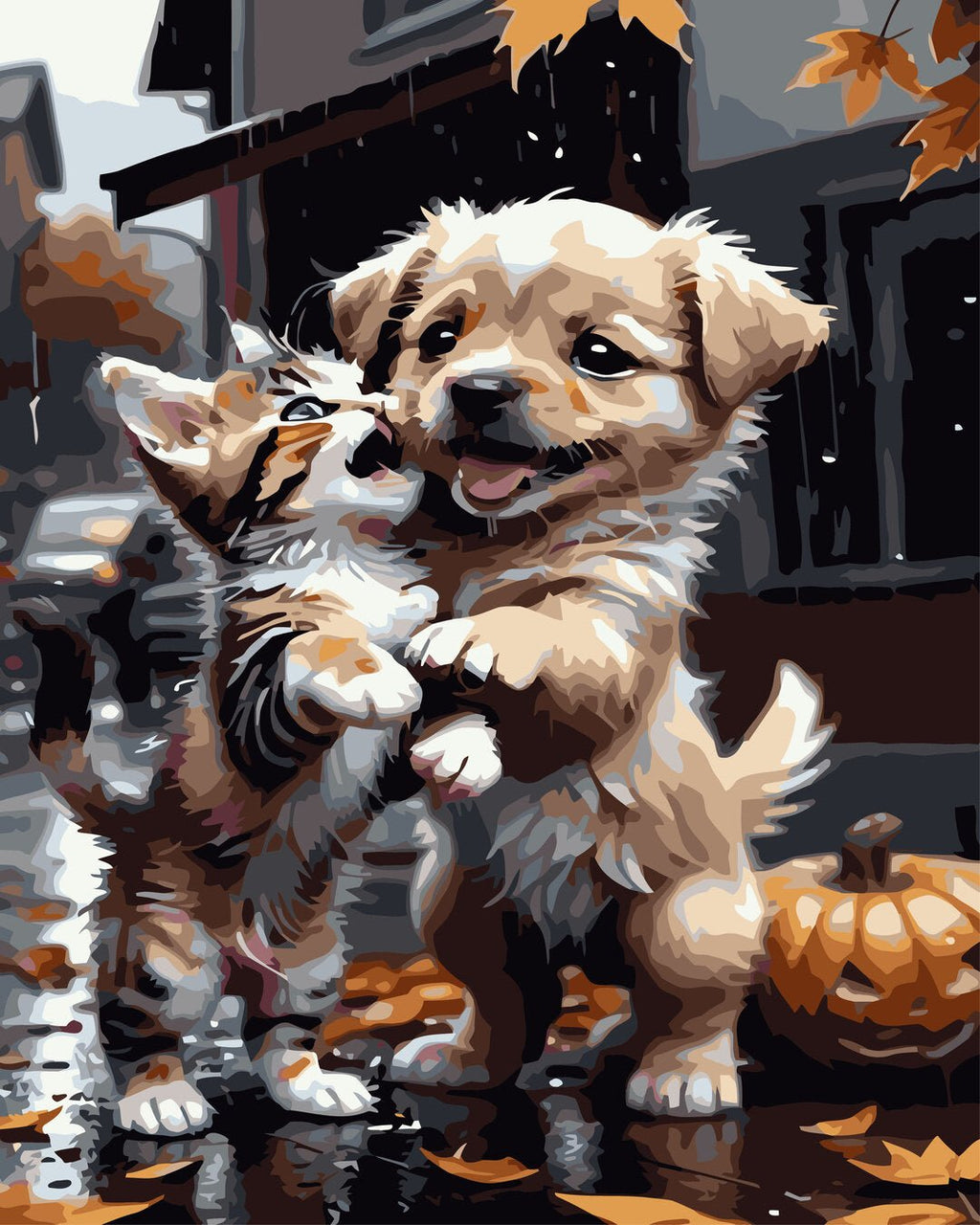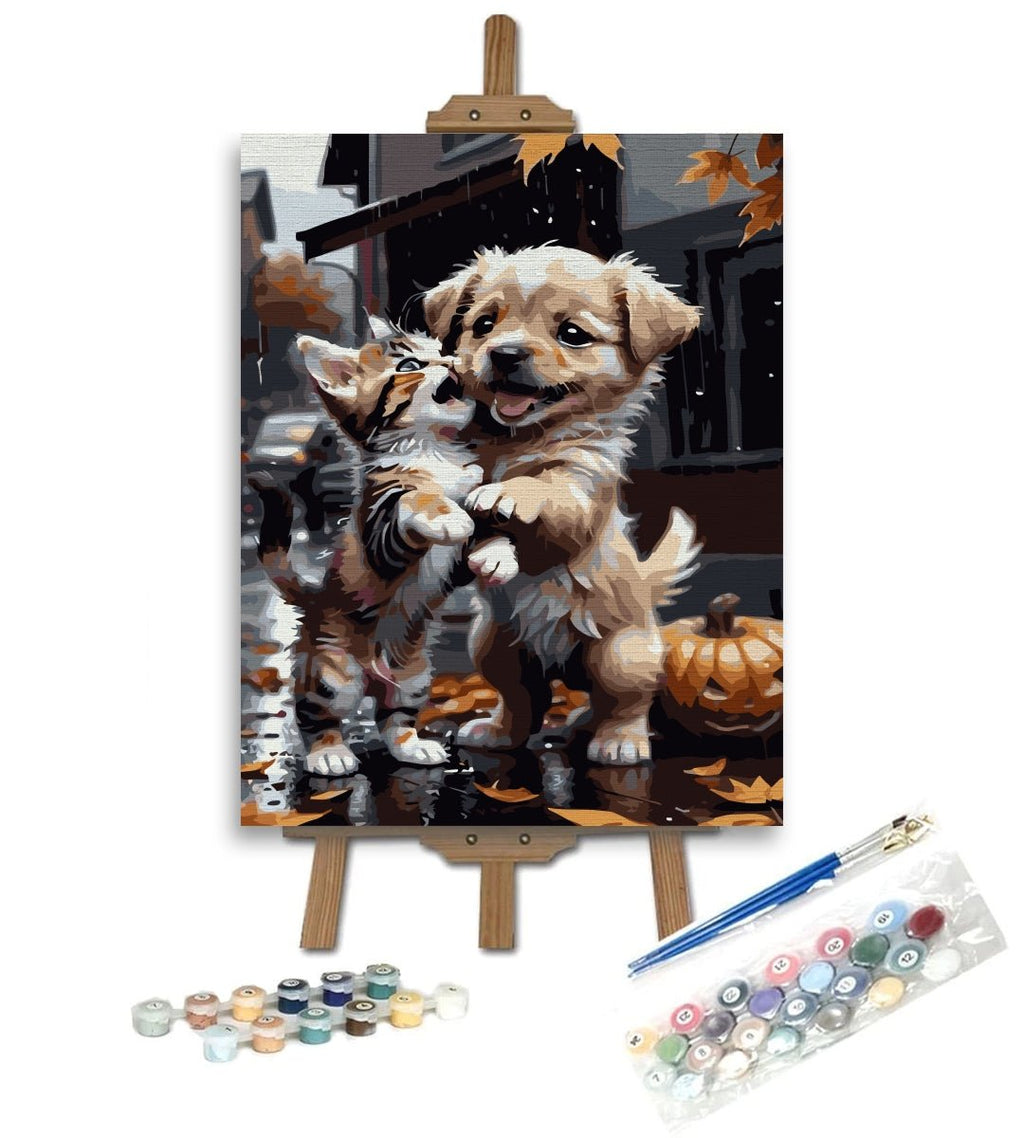 Toamna se numără bobocii sau...prietenii. Așa cum sunt un pui de pisică și unul de câine, reprezentați în pictura pe numere Prieteni (Buddies). Despre prietenii în lumea necuvântătoarelor puteți afla și pictând un astfel de tablou.