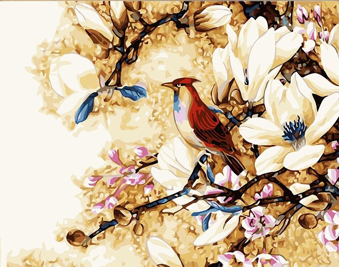 Pictura pe numere Red Cardinal bird pune în prim plan renașterea naturii și penajul colorat al unei specii de pasăre deosebită. Pictează frumusețea exemplificată de natură și vietate zburătoare.