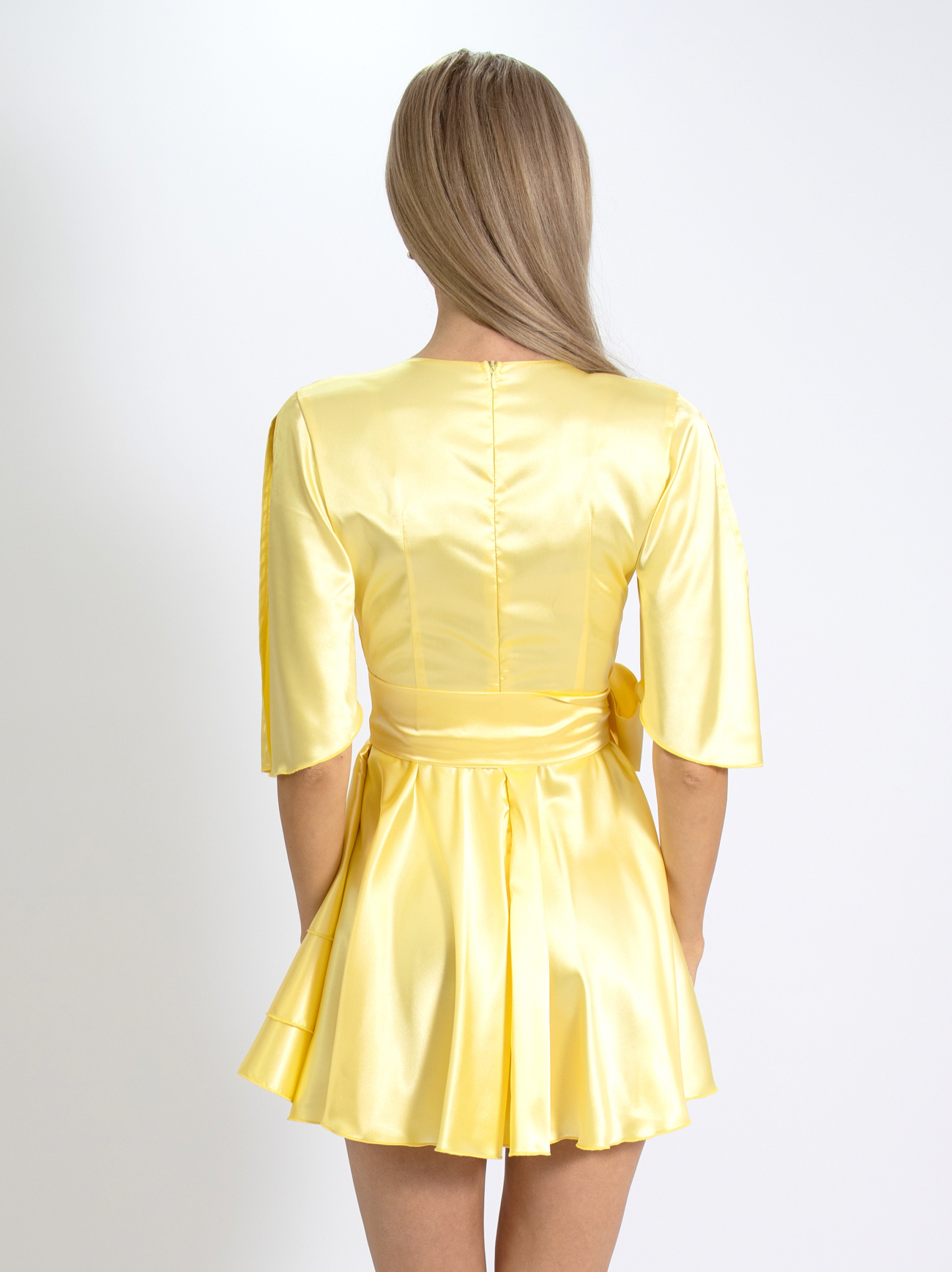 Rochie scurta cu croi tip baby doll,cu maneca scurta, despicata si decolteu in V din Satin. Partea de jos este confectionata tip clos din mai multe volanase. Talia este evidentiata atat de croiul dulce baby doll, dar si de cordonul din talie, cu care puteti lega o fundita. Rochita se inchide cu fermoar la spate. Printr-o croiala unica, atent confectionata pentru a iesi in evidenta, rochia este realizata dupa un tipar de succes, potrivindu-se pentru orice tip de silueta. Simpla, dar in