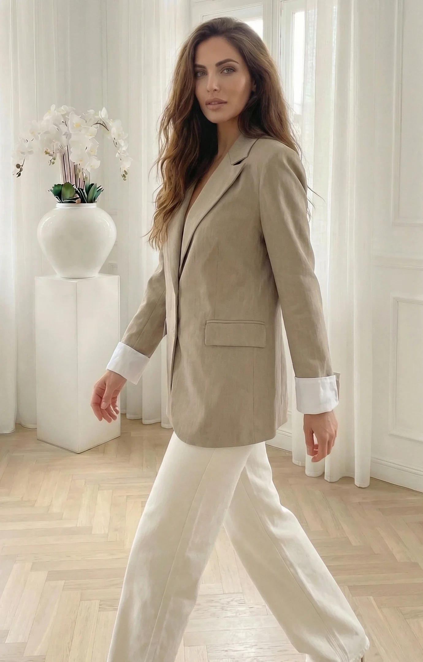 Sacou dama bej nisipiu cu croiala clasica si inchidere cu doi nasturi, o piesa vestimentara ideala pentru a adauga un plus de eleganta si luminozitate garderobei tale de sezon. Realizat intr-o nuanta naturala si calda de bej nisipiu, acest sacou se remarc
